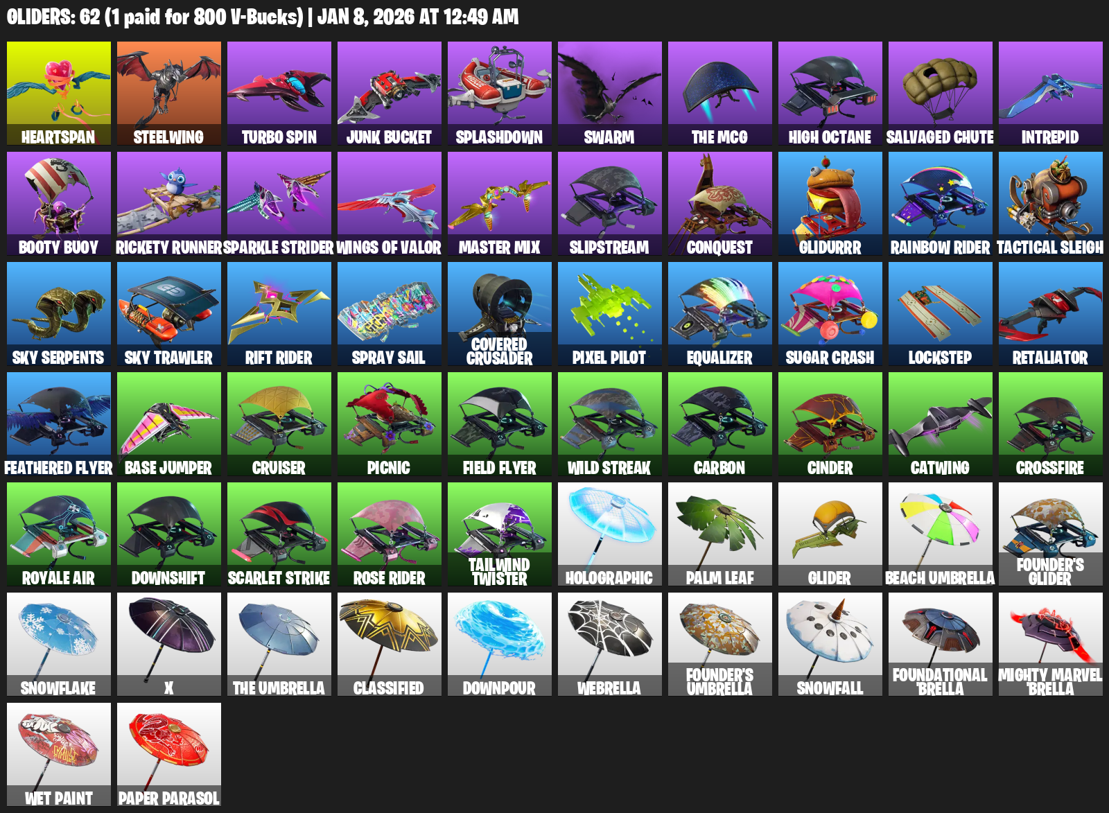 Heartspan, Steelwing, Turbo Spin, Junk Bucket, Splashdown, Swarm, High Octane, Salvaged Chute, Intrepid, Booty Buoy, Rickety Runner, Sparkle Strider, Wings of Valor, Slipstream, Conquest, Glidurrr, Tactical Sleigh