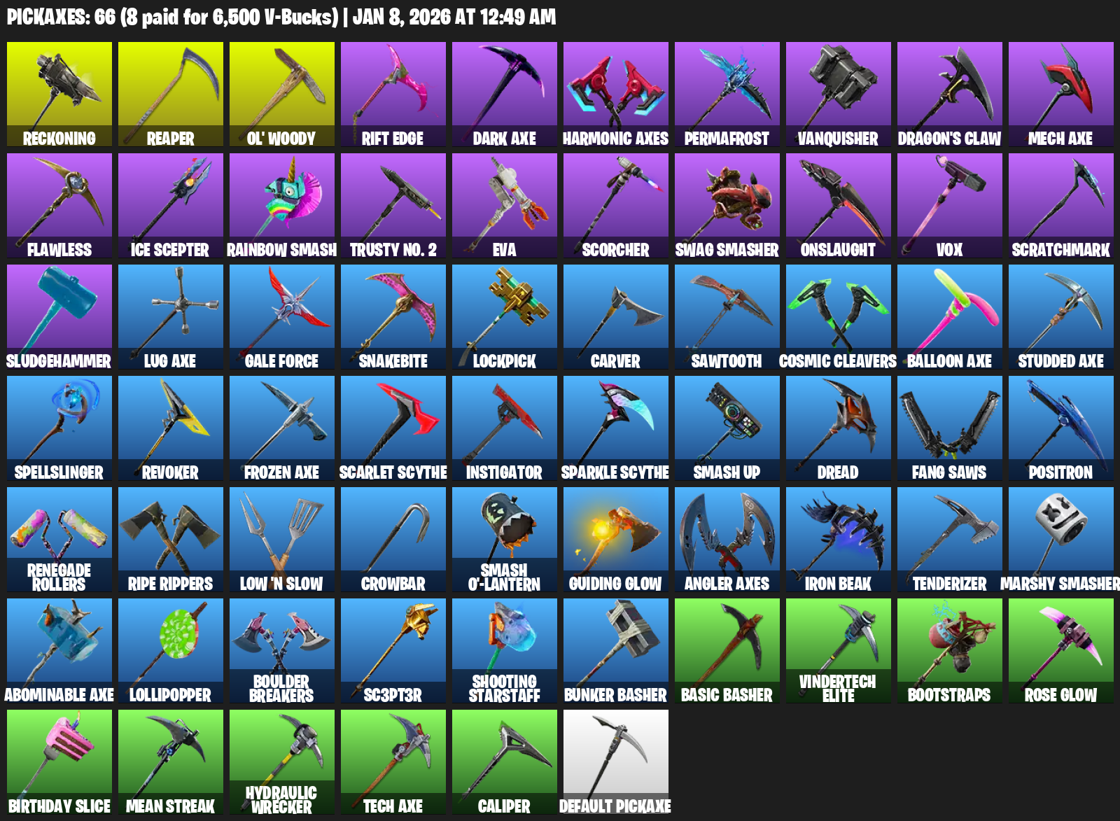 Reckoning, Ol’ Woody, Rift Edge, Harmonic Axes, Permafrost, Vanquisher, Dragon’s Claw, Mech Axe, Flawless, Ice Scepter, Rainbow Smash, Trusty No. 2, EVA, Scorcher, Swag Smasher, Onslaught, Vox, Scratchmark