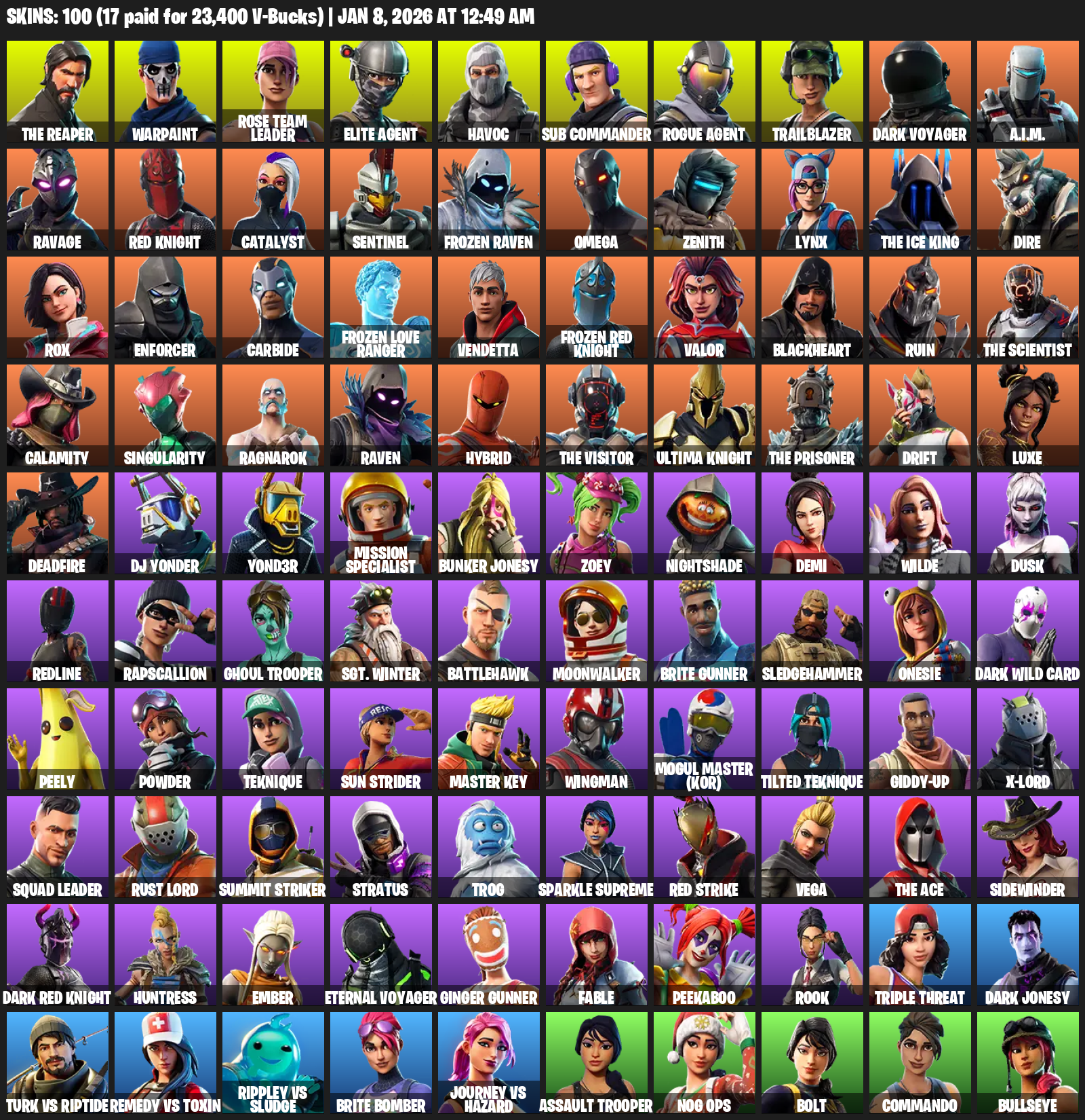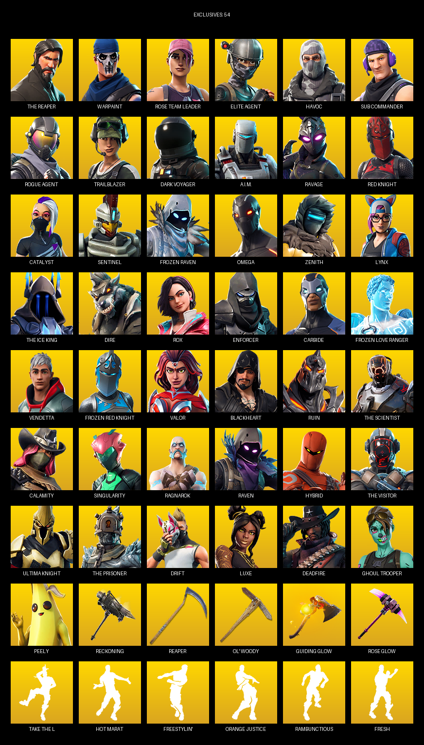 The Reaper, Elite Agent, Omega, Warpaint, Rose Team Leader, Havoc, Sub Commander, Trailblazer, Dark Voyager, A.I.M., Ravage, Red Knight, Catalyst, Sentinel, Frozen Raven, Zenith, Lynx, Dire