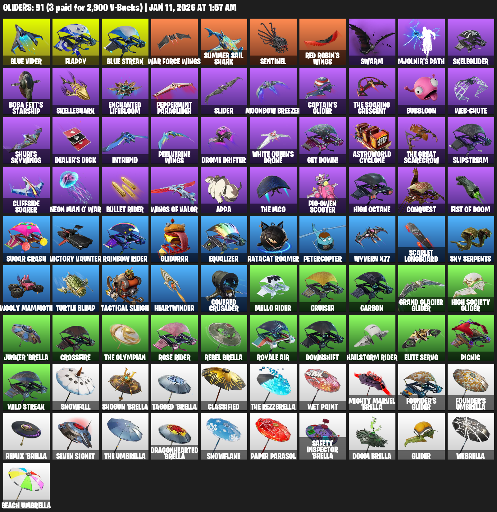 Flappy, War Force Wings, Summer Sail Shark, Sentinel, Swarm, Mjolnir’s Path, Skeleglider, Boba Fett’s Starship, Skelleshark, Enchanted Lifebloom, Peppermint Paraglider, Slider, Moonbow Breezer, Captain’s Glider, Bubbloon