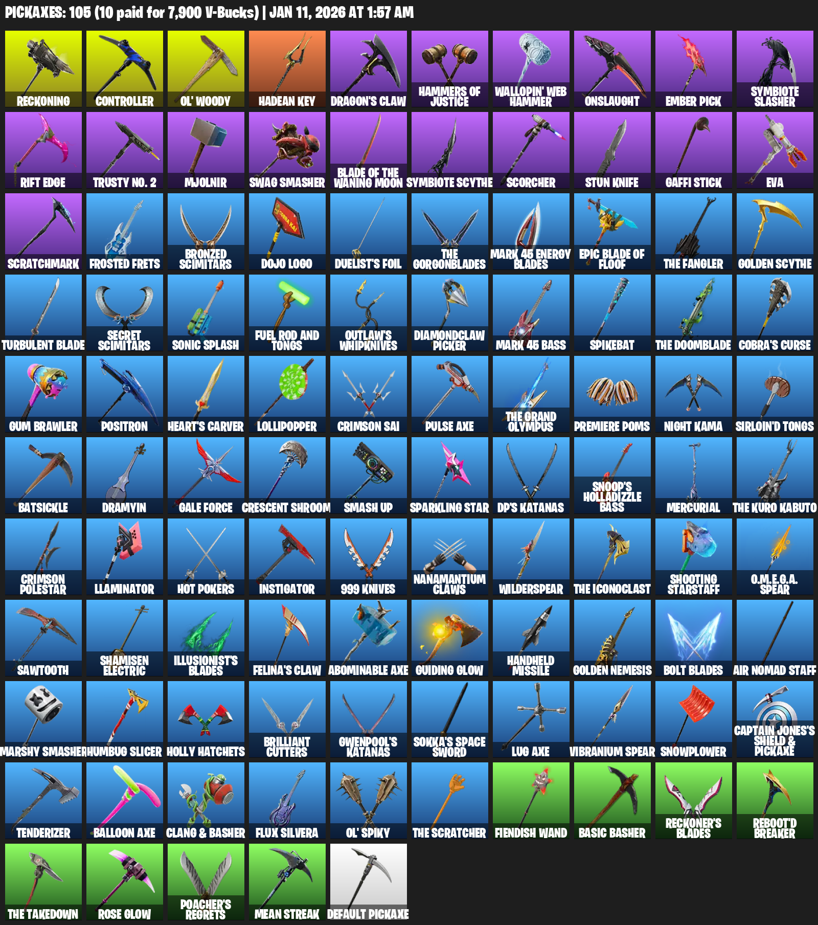 Reckoning, Controller, Ol’ Woody, Hadean Key, Dragon’s Claw, Hammers of Justice, Wallopin’ Web Hammer, Onslaught, Ember Pick, Symbiote Slasher, Rift Edge, Trusty No. 2, Mjolnir, Swag Smasher, Scorcher, Stun Knife, Gaffi Stick, EVA