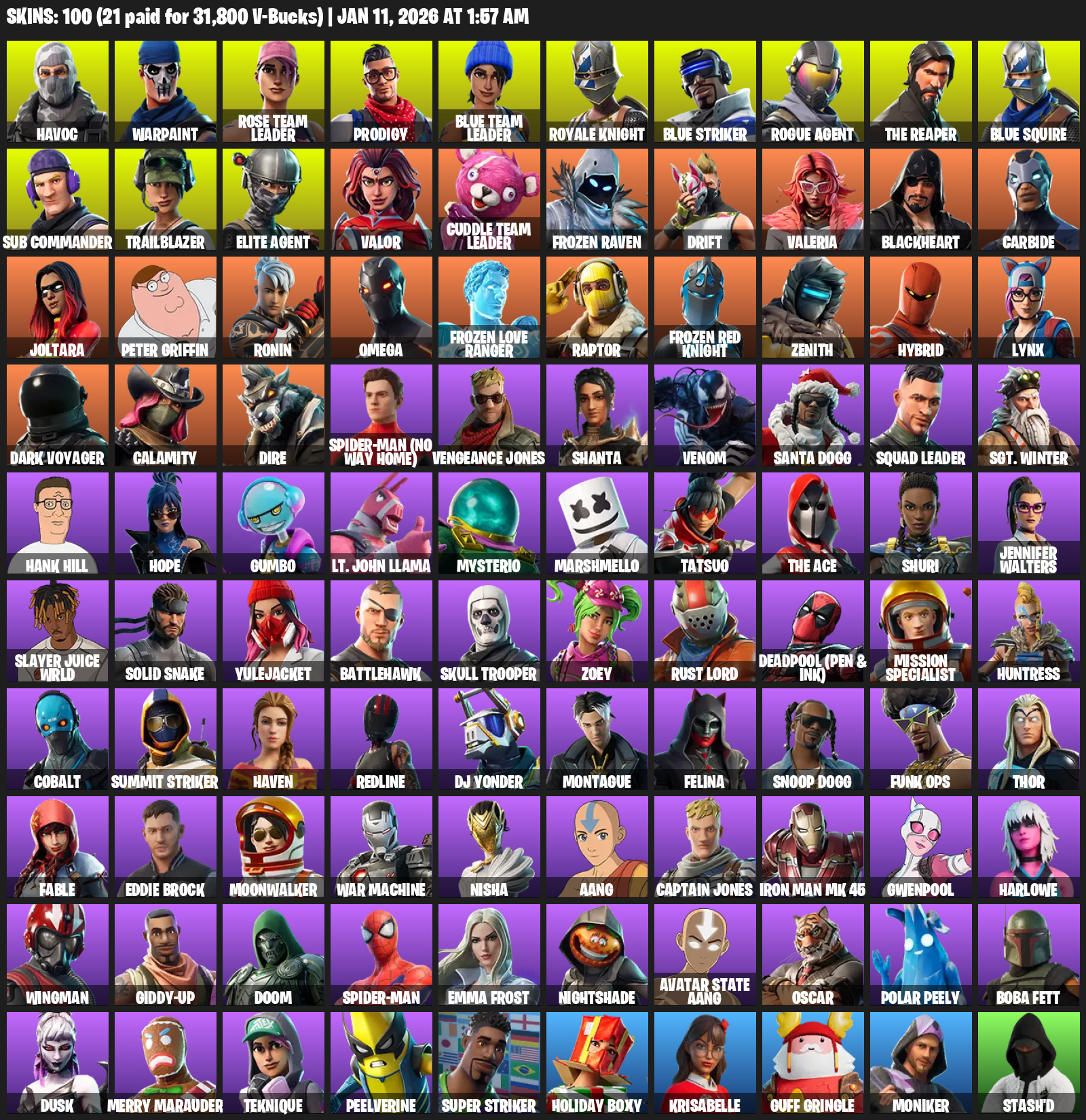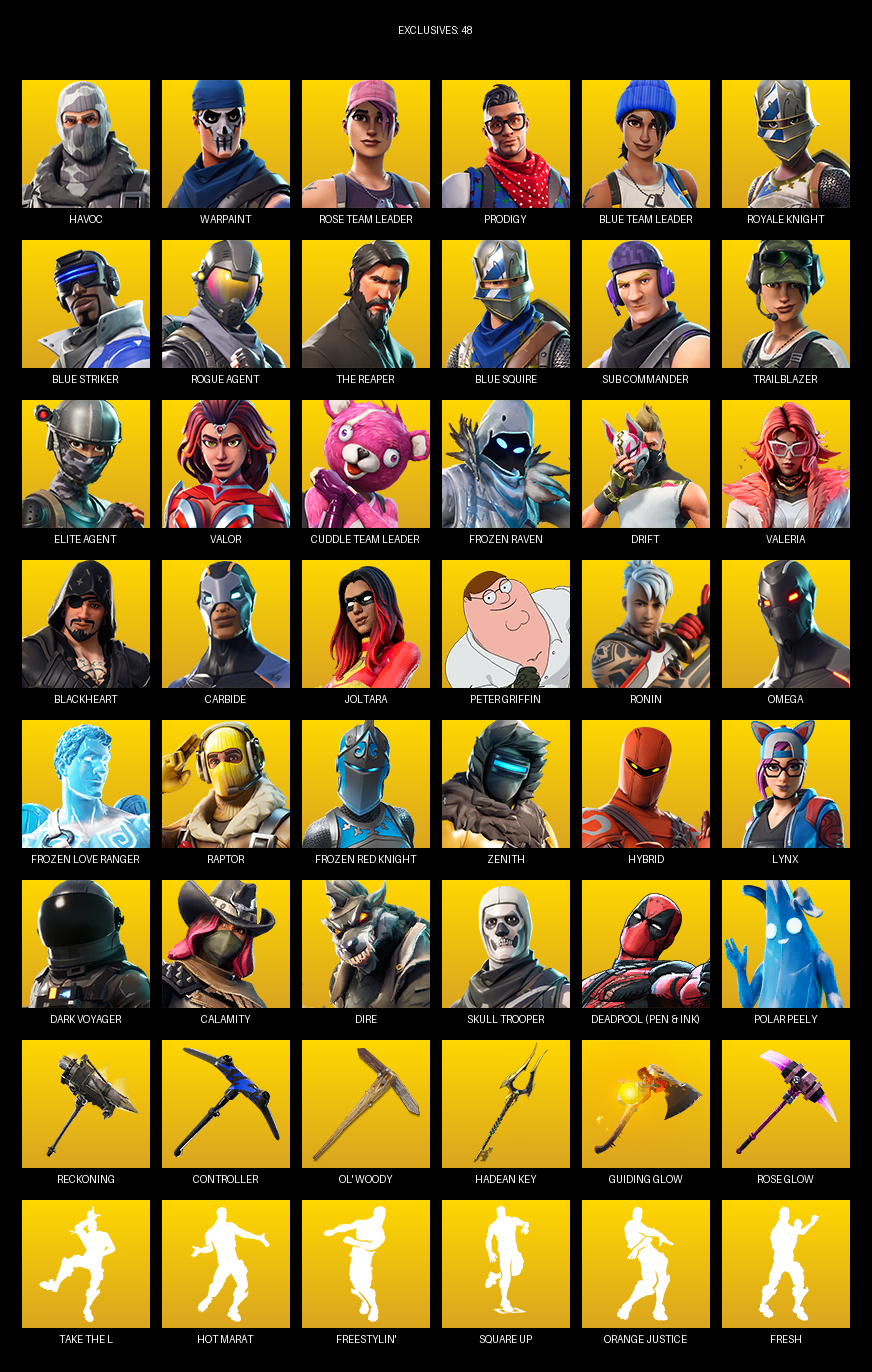 Royale Knight, The Reaper, Blue Squire, Elite Agent, Omega, Havoc, Warpaint, Rose Team Leader, Prodigy, Sub Commander, Trailblazer, Valor, Frozen Raven, Drift, Valeria, Blackheart
