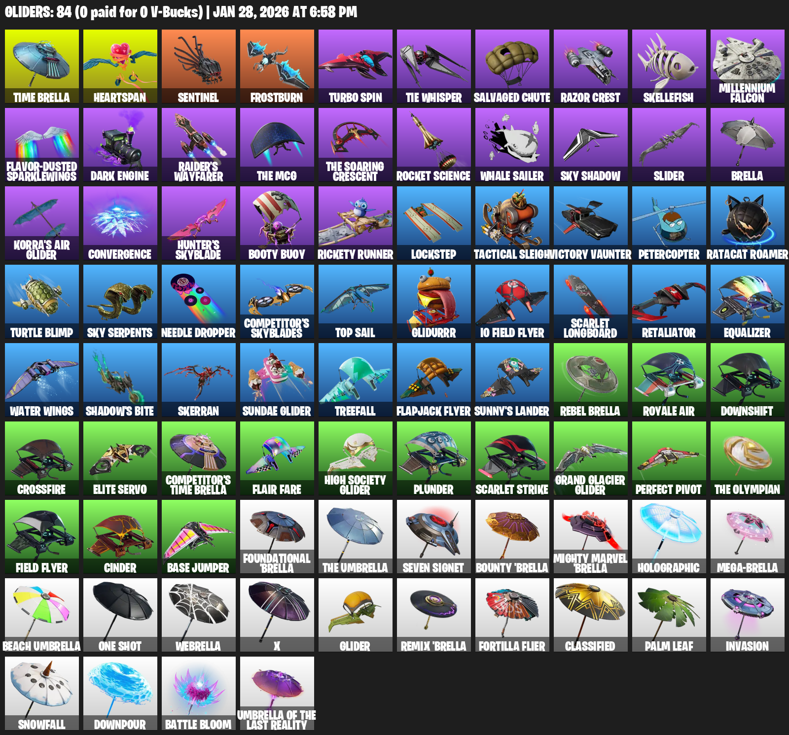 Time Brella, Heartspan, Frostburn, Turbo Spin, TIE Whisper, Salvaged Chute, Razor Crest, Skellefish, Millennium Falcon, Flavor-Dusted Sparklewings, Dark Engine, Raider’s Wayfarer, Rocket Science, Whale Sailer, Sky Shadow, Slider