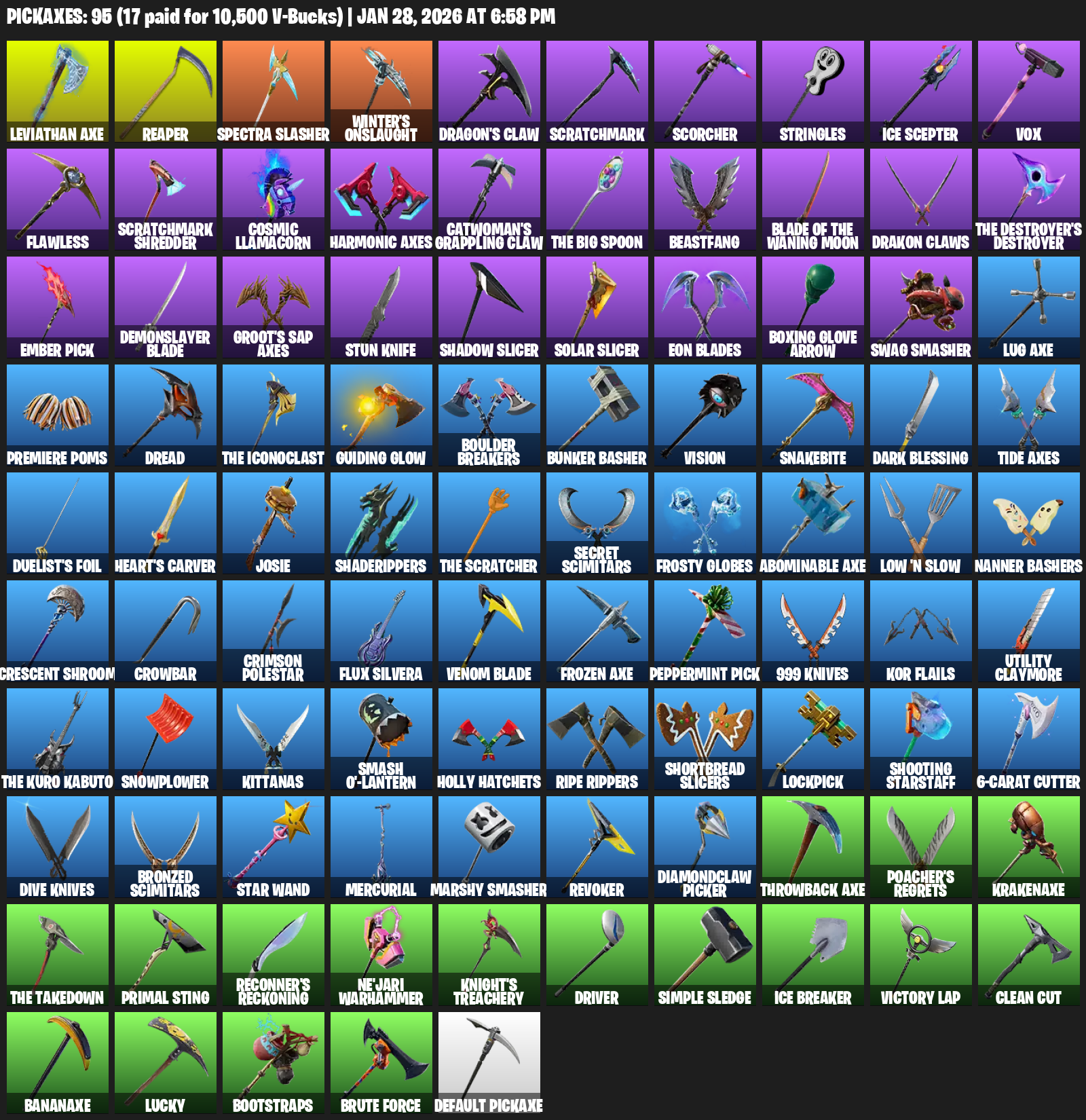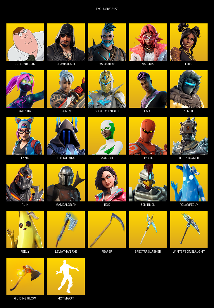 Leviathan Axe, Reaper, Winter’s Onslaught, Dragon’s Claw, Scratchmark, Scorcher, Stringles, Vox, Flawless, Cosmic Llamacorn, Harmonic Axes, Beastfang, Drakon Claws