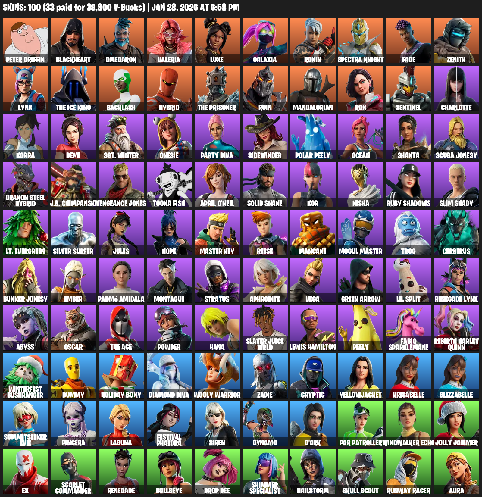 Peter Griffin, Blackheart, Omegarok, Valeria, Luxe, Galaxia, Ronin, Spectra Knight, Fade, Zenith, Lynx, The Ice King, Backlash, Hybrid, Ruin, Mandalorian, Rox, Sentinel, Charlotte