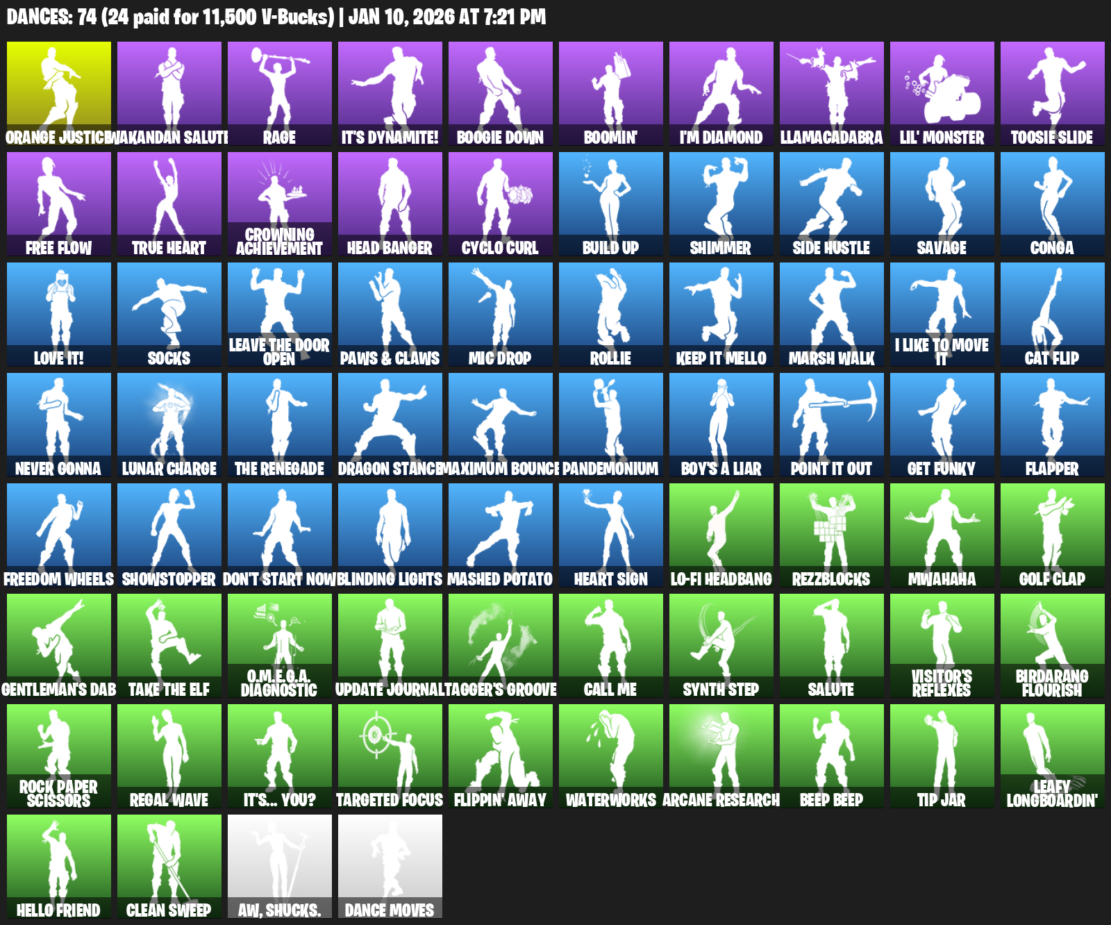 Orange Justice, Wakandan Salute, Rage, It’s Dynamite!, Boogie Down, Boomin’, I’m Diamond, Llamacadabra, Lil’ Monster, Toosie Slide, Free Flow, True Heart, Crowning Achievement, Head Banger, Cyclo Curl, Build Up, Shimmer, Side Hustle, Savage, Conga