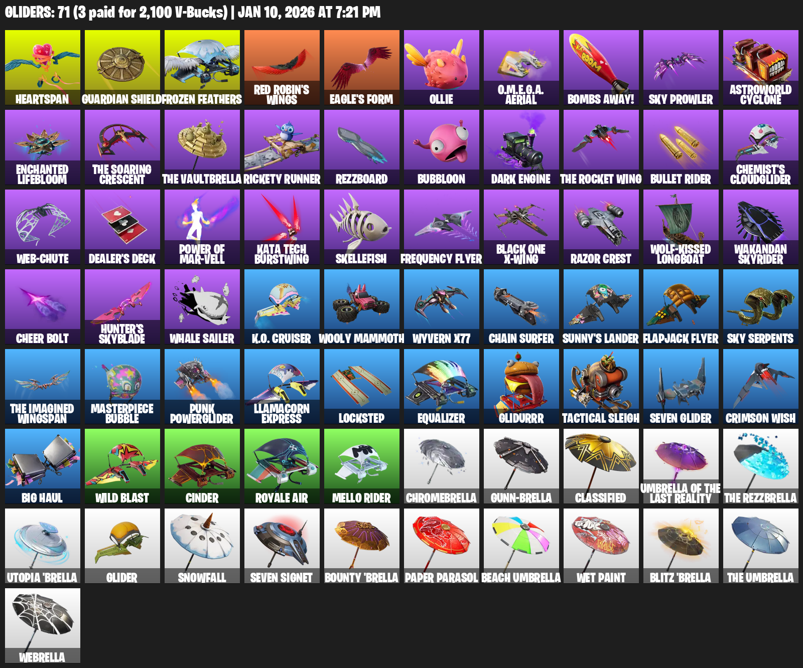 Heartspan, Guardian Shield, Eagle’s Form, Ollie, O.M.E.G.A. Aerial, Bombs Away!, Sky Prowler, Astroworld Cyclone, Enchanted Lifebloom, Rickety Runner, Rezzboard, Bubbloon, Dark Engine, Bullet Rider, Chemist’s Cloudglider