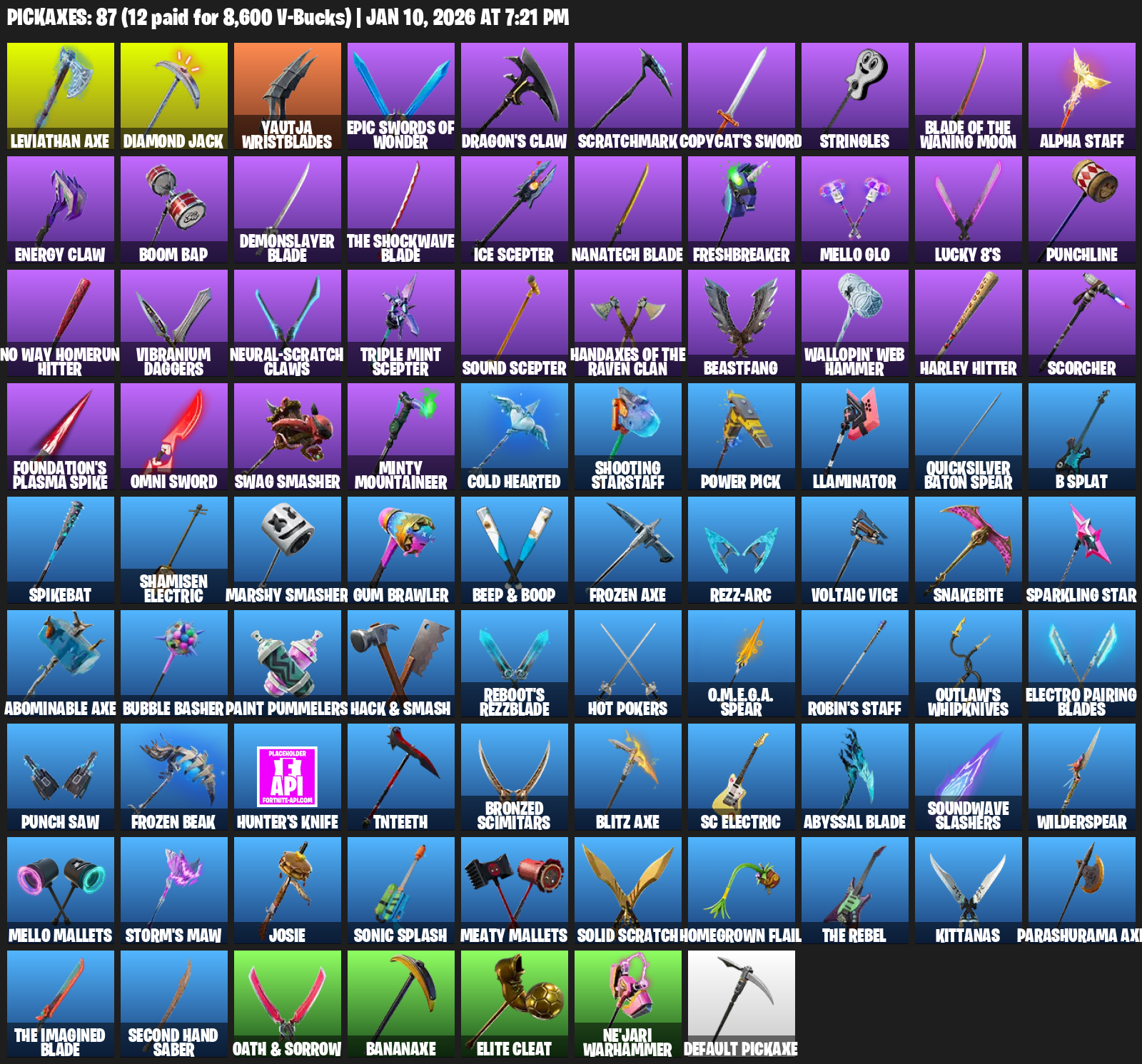 Leviathan Axe, Yautja Wristblades, Dragon’s Claw, Scratchmark, Copycat’s Sword, Stringles, Alpha Staff, Boom Bap, Demonslayer Blade, Freshbreaker, Mello Glo, Lucky 8’s, Punchline