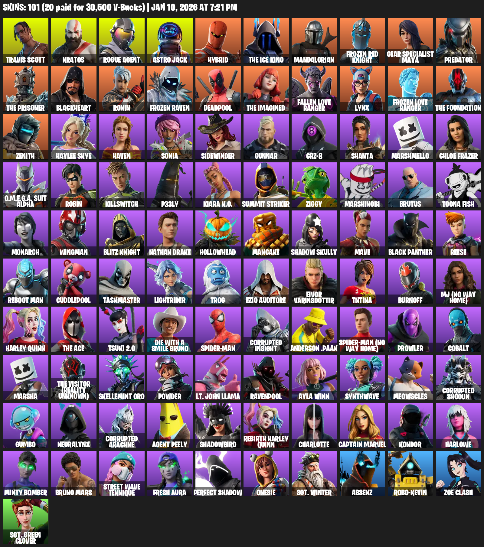 Travis Scott, Gear Specialist Maya, Kratos, Rogue Agent, Astro Jack, Hybrid, The Ice King, Mandalorian, Frozen Red Knight, Predator, Blackheart, Ronin, Deadpool, Fallen Love Ranger, Lynx