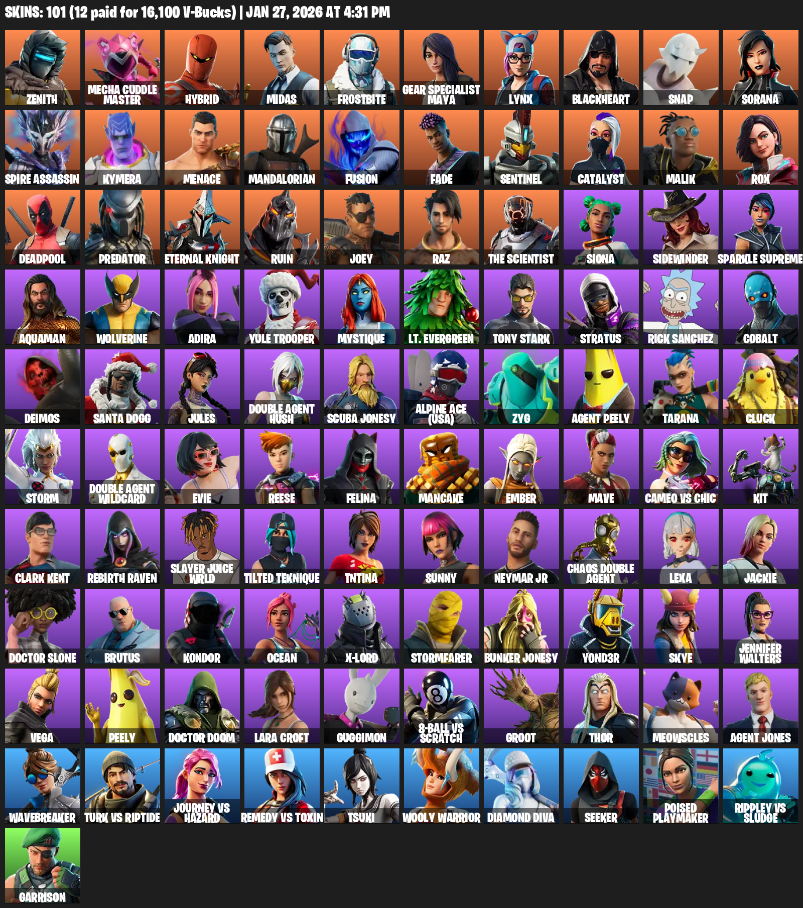 [PC/PSN/XBOX] | 101 skins | Lara Croft | Zenith | Mecha Cuddle Master | Hybrid | Midas | Frostbite | Gear Specialist Maya | Lynx | #CCV4440
