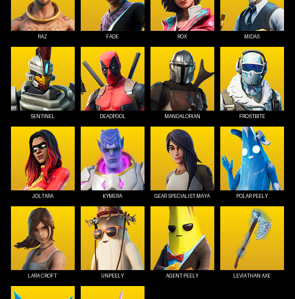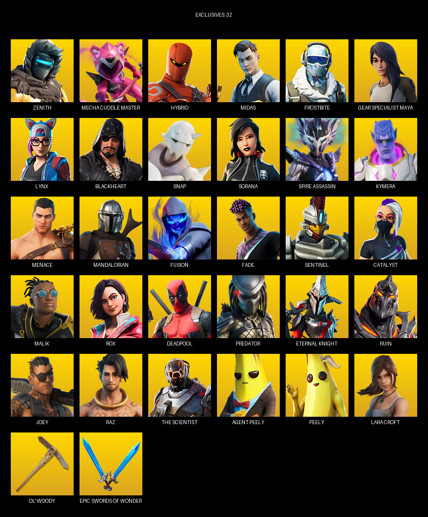 Gear Specialist Maya, Lara Croft, Zenith, Mecha Cuddle Master, Hybrid, Midas, Frostbite, Lynx, Blackheart, Snap, Sorana, Spire Assassin, Kymera, Menace, Mandalorian, Fusion, Fade, Sentinel, Catalyst, Malik