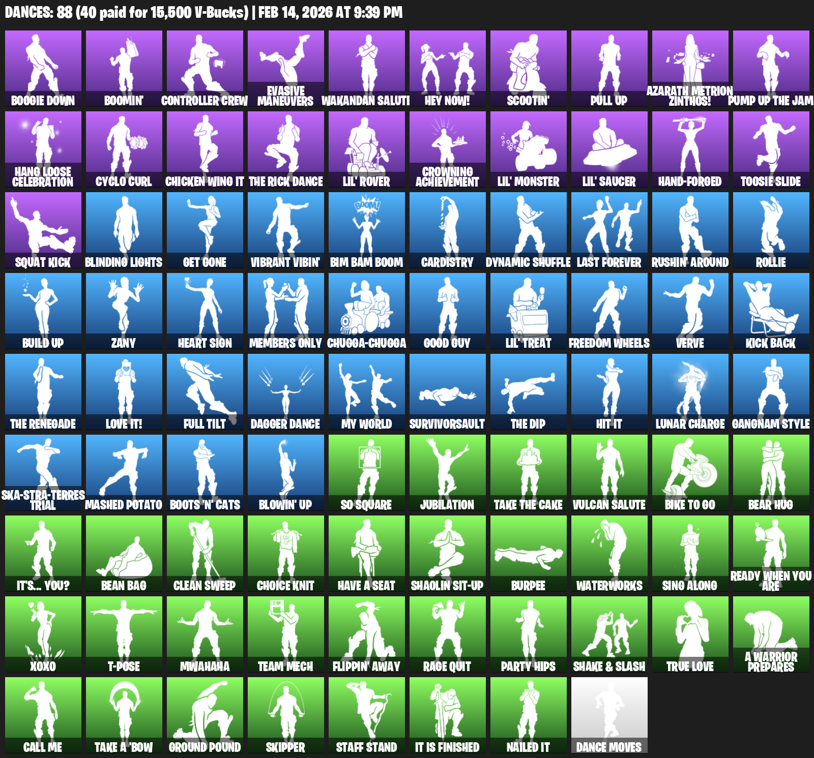 Boogie Down, Boomin’, Controller Crew, Evasive Maneuvers, Wakandan Salute, Hey Now!, Scootin’, Pull Up, Azarath Metrion Zinthos!, Hang Loose Celebration, Cyclo Curl, Chicken Wing It, Lil’ Rover, Crowning Achievement, Hand-Forged, Toosie Slide