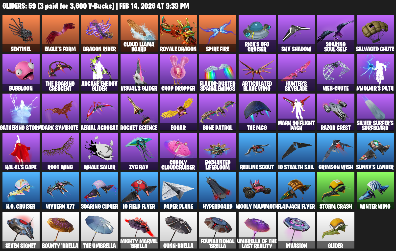 Sentinel, Eagle’s Form, Rick’s UFO Cruiser, Sky Shadow, Soaring Soul-Self, Salvaged Chute, Bubbloon, Visual’s Glider, Chop Dropper, Flavor-Dusted Sparklewings, Hunter’s Skyblade, Mjolnir’s Path