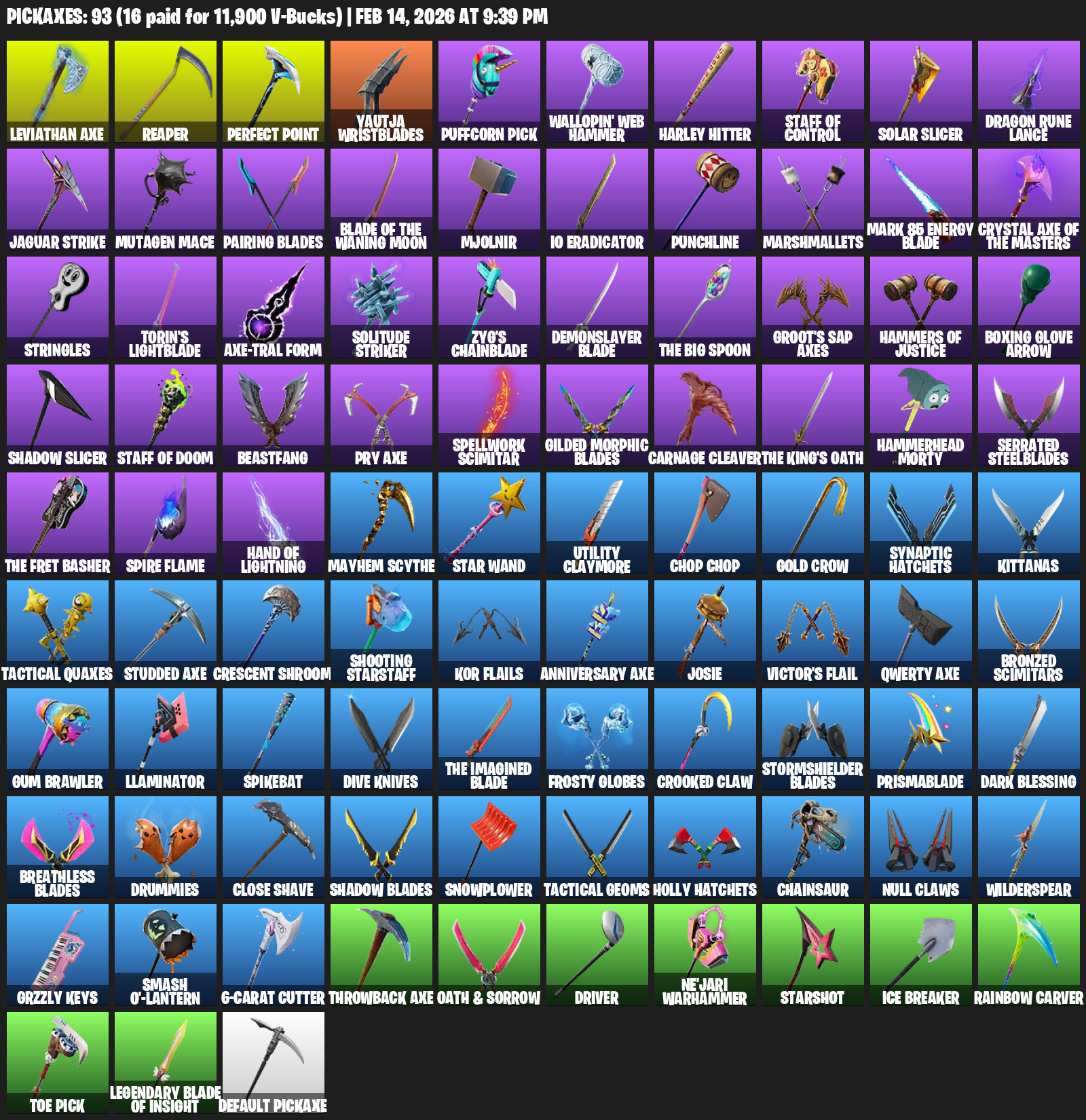Leviathan Axe, Reaper, Perfect Point, Yautja Wristblades, Puffcorn Pick, Wallopin’ Web Hammer, Harley Hitter, Staff of Control, Solar Slicer, Dragon Rune Lance, Jaguar Strike, Mutagen Mace, Pairing Blades, Mjolnir, IO Eradicator, Punchline, Marshmallets, Mark 85 Energy Blade