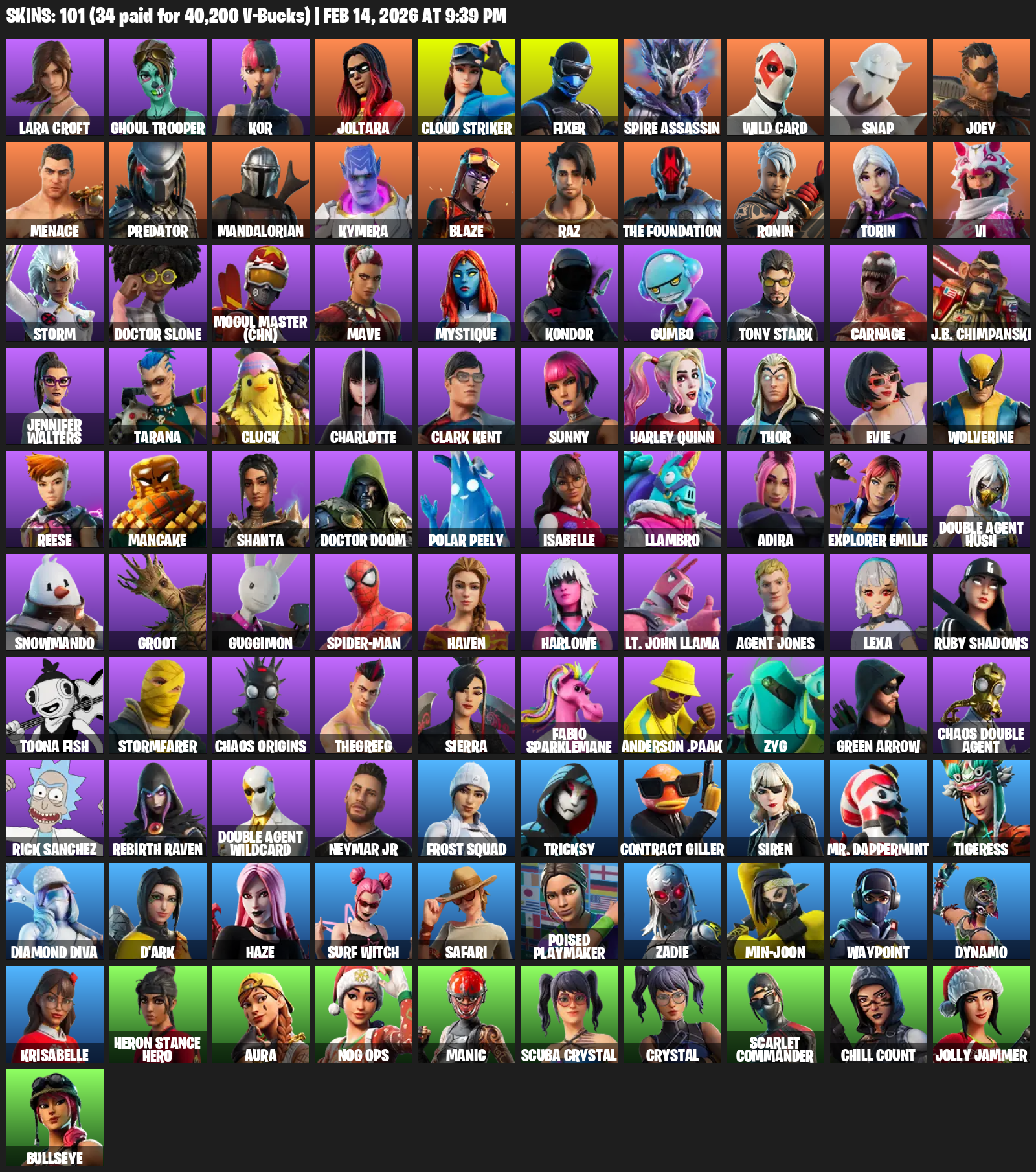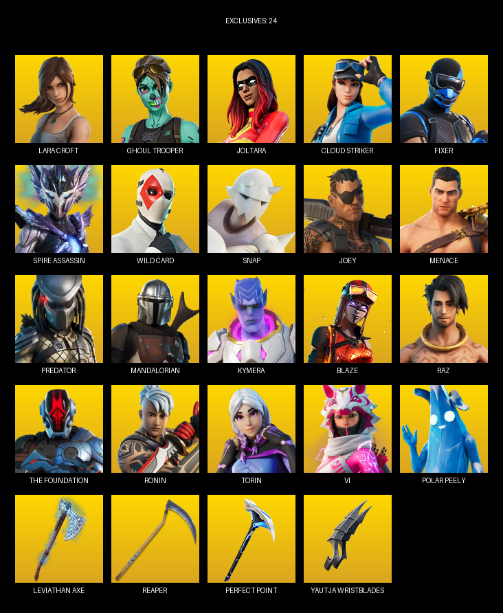 Lara Croft, Ghoul Trooper, Kor, Joltara, Cloud Striker, Fixer, Spire Assassin, Wild Card, Snap, Joey, Menace, Predator, Mandalorian, Kymera, Blaze, Raz, The Foundation, Ronin, Torin, Vi
