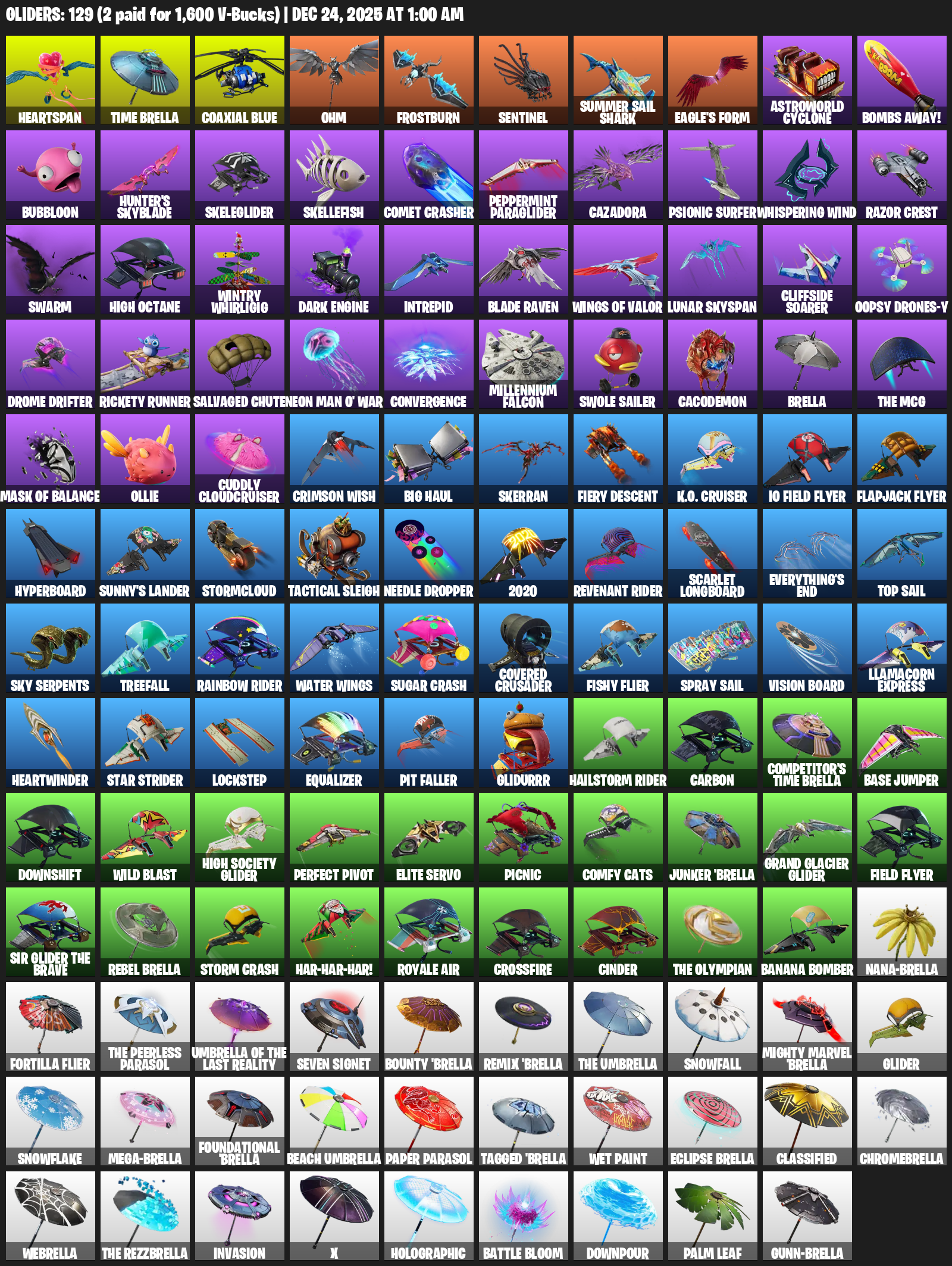 Heartspan, Time Brella, Coaxial Blue, Ohm, Frostburn, Sentinel, Summer Sail Shark, Astroworld Cyclone, Bombs Away!, Bubbloon, Hunter’s Skyblade, Skeleglider, Skellefish, Comet Crasher, Peppermint Paraglider, Cazadora, Psionic Surfer, Whispering Wind, Razor Crest