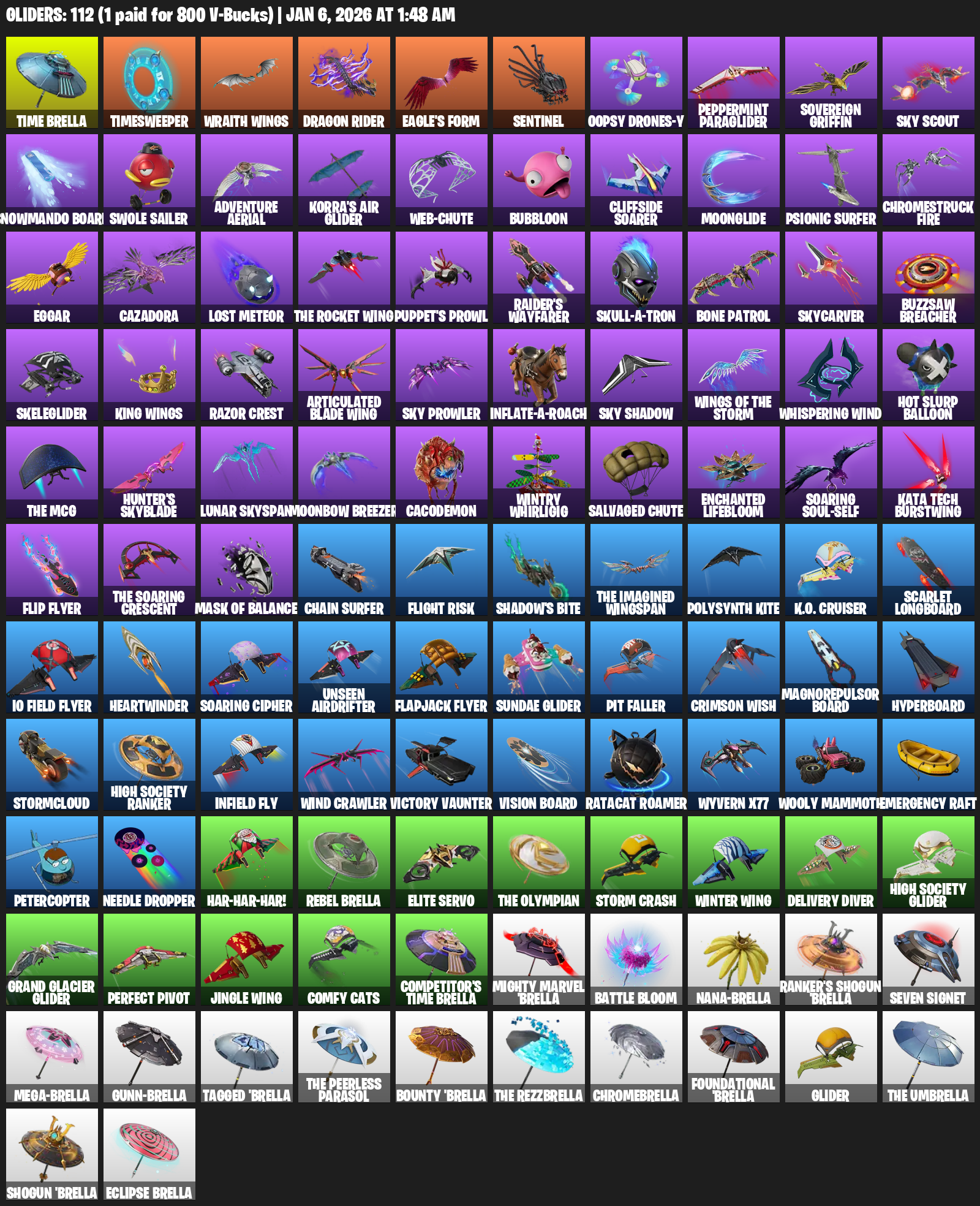 Time Brella, Timesweeper, Wraith Wings, Dragon Rider, Eagle’s Form, Sentinel, Oopsy Drones-y, Peppermint Paraglider, Sky Scout, Snowmando Board, Swole Sailer, Adventure Aerial, Korra’s Air Glider, Bubbloon, Cliffside Soarer, Moonglide, Psionic Surfer, Chromestruck Fire