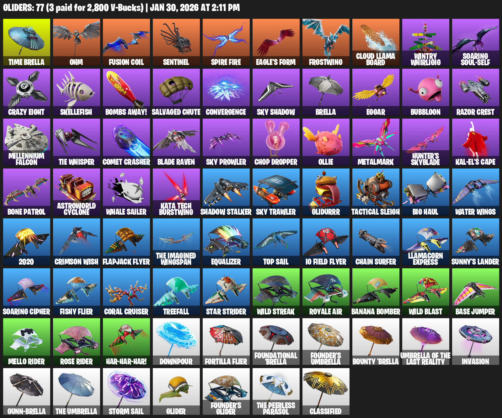 Time Brella, Ohm, Sentinel, Eagle’s Form, Frostwing, Cloud Llama Board, Wintry Whirligig, Soaring Soul-Self, Crazy Eight, Skellefish, Bombs Away!, Salvaged Chute, Convergence, Eggar, Bubbloon, Razor Crest