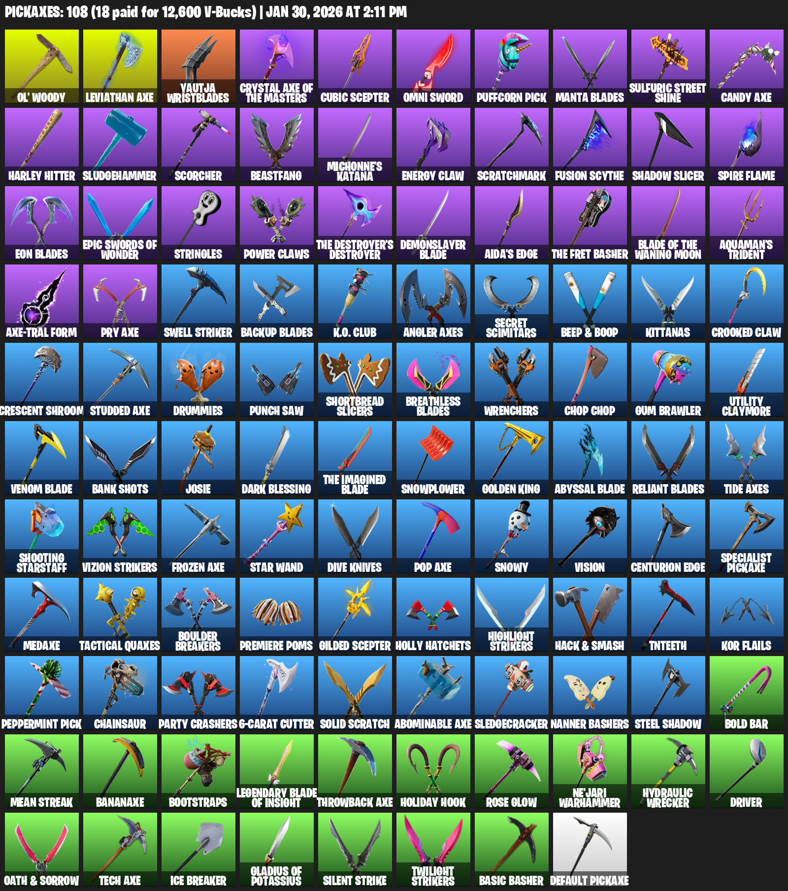 Leviathan Axe, Ol’ Woody, Yautja Wristblades, Cubic Scepter, Omni Sword, Puffcorn Pick, Manta Blades, Sulfuric Street Shine, Harley Hitter, Sludgehammer, Scorcher, Beastfang, Michonne’s Katana, Energy Claw, Scratchmark, Shadow Slicer