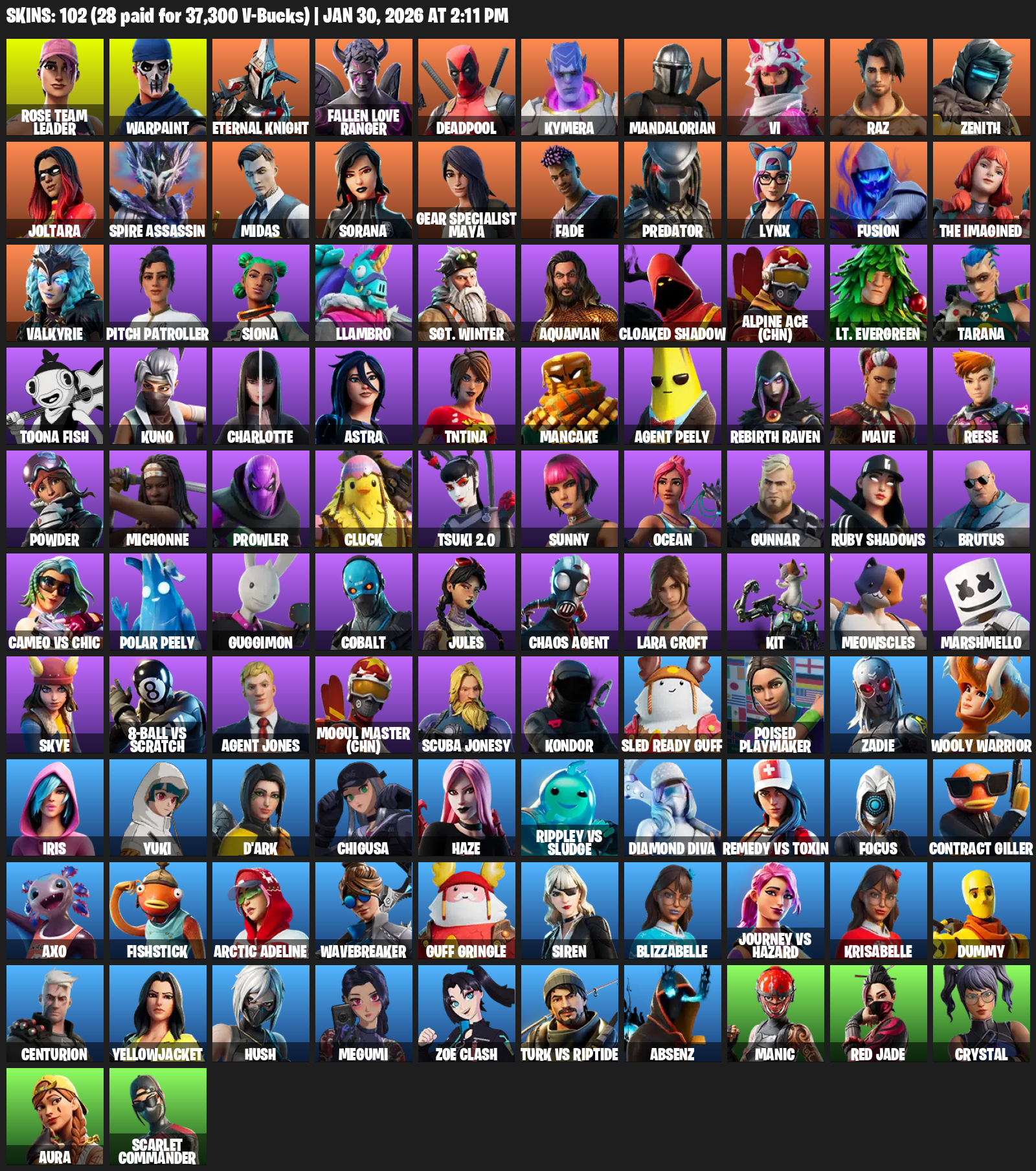 [PC/PSN/XBOX] | 102 skins | Leviathan Axe | OG STW | Lara Croft | Rose Team Leader | Warpaint | Eternal Knight | Fallen Love Ranger | #SDT8344