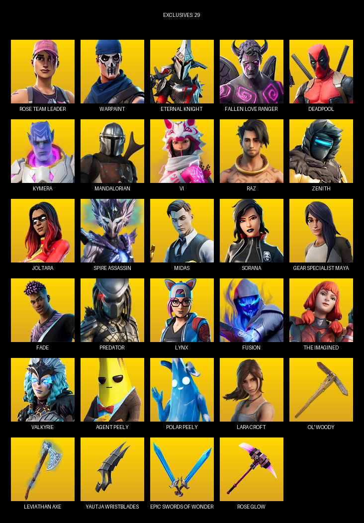 Gear Specialist Maya, Lara Croft, Rose Team Leader, Warpaint, Eternal Knight, Fallen Love Ranger, Deadpool, Kymera, Mandalorian, Vi, Raz, Zenith, Joltara, Spire Assassin, Midas, Sorana, Fade, Predator, Lynx, Fusion