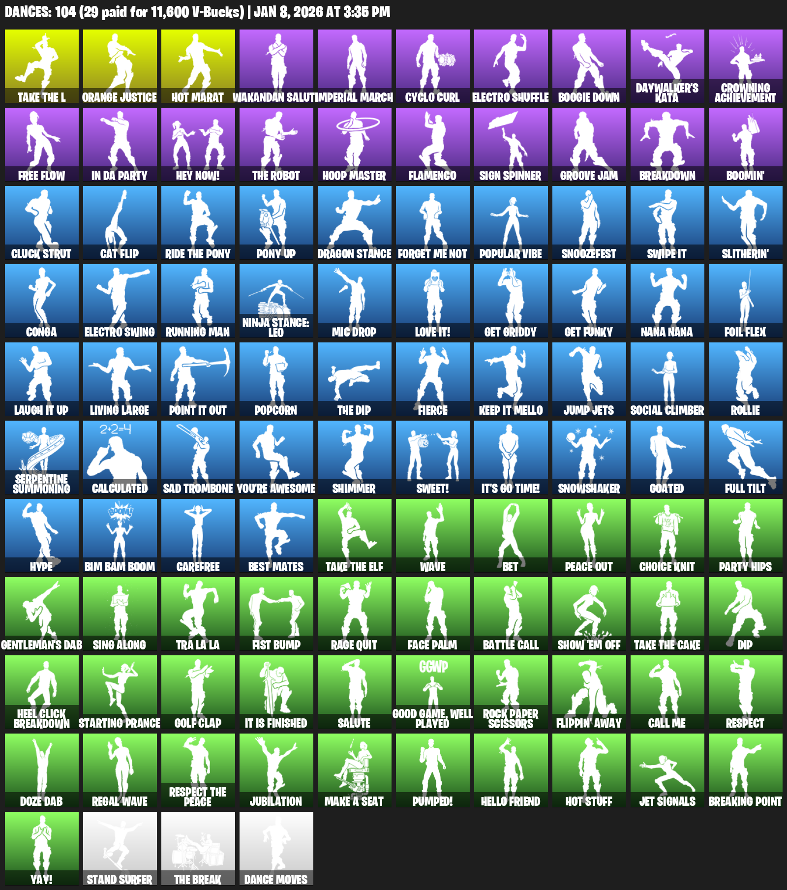 Hot Marat, Orange Justice, Wakandan Salute, Imperial March, Cyclo Curl, Electro Shuffle, Boogie Down, Daywalker’s Kata, Crowning Achievement, Free Flow, In Da Party, Hey Now!, Hoop Master, Flamenco, Sign Spinner, Groove Jam, Breakdown, Boomin’