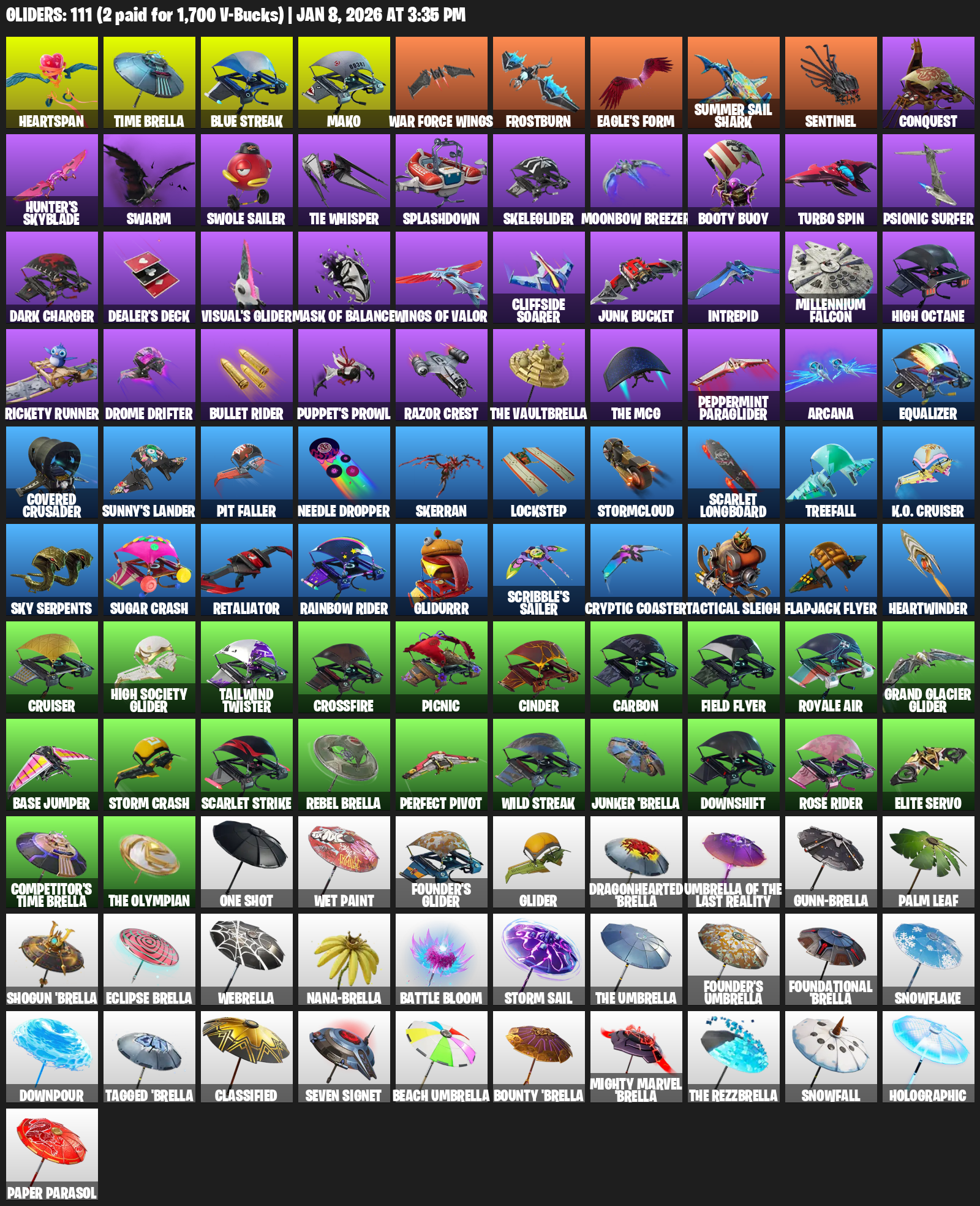 Mako, Heartspan, Time Brella, Blue Streak, War Force Wings, Frostburn, Eagle’s Form, Summer Sail Shark, Sentinel, Conquest, Hunter’s Skyblade, Swarm, Swole Sailer, TIE Whisper, Splashdown, Skeleglider, Moonbow Breezer, Booty Buoy, Turbo Spin, Psionic Surfer