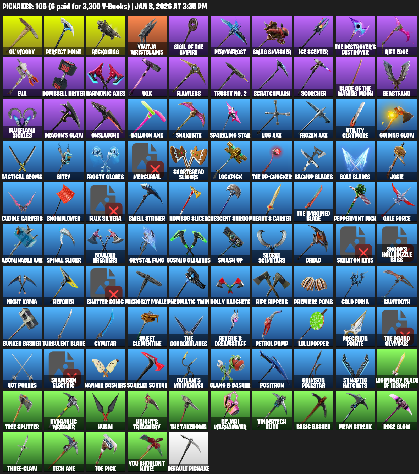 Ol’ Woody, Perfect Point, Reckoning, Yautja Wristblades, Permafrost, Swag Smasher, Ice Scepter, Rift Edge, EVA, Dumbbell Driver, Harmonic Axes, Vox, Flawless, Trusty No. 2, Scratchmark, Scorcher, Beastfang