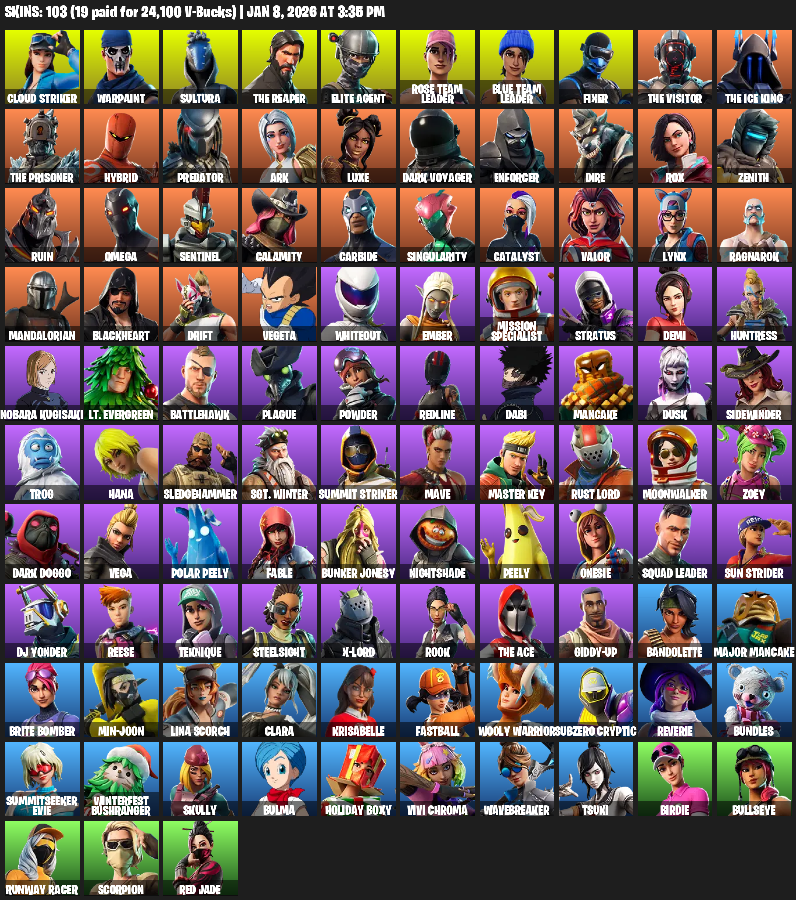 The Reaper, Elite Agent, Omega, Cloud Striker, Warpaint, Sultura, Rose Team Leader, Fixer, Hybrid, Predator, Ark, Luxe, Dark Voyager, Enforcer, Dire, Rox