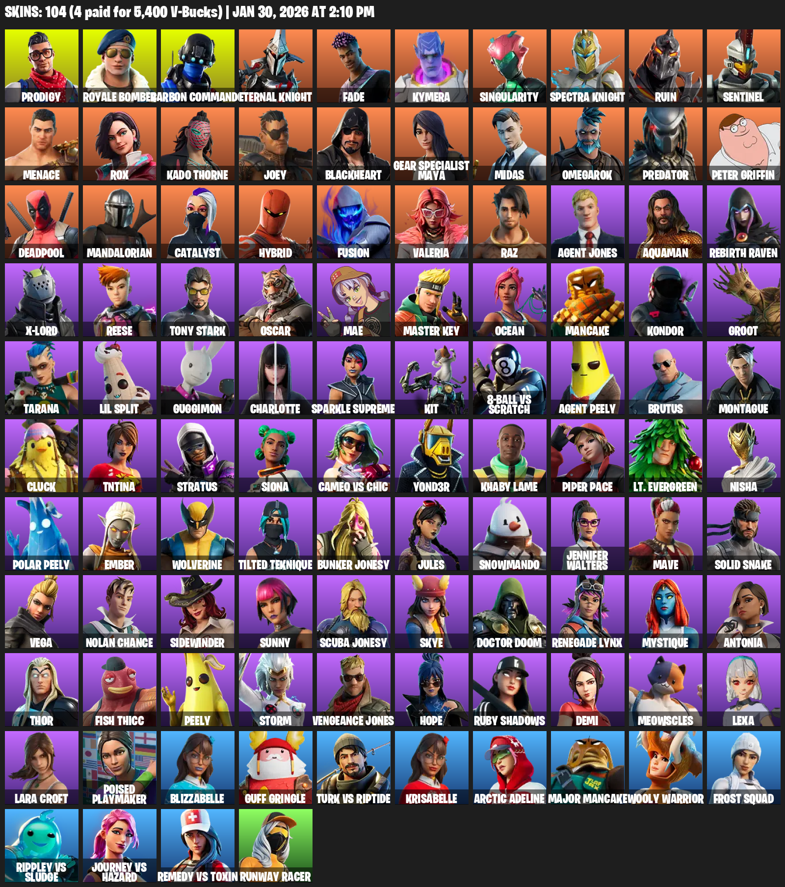 [PC/PSN/XBOX] | 104 skins | 1950 V-bucks | Leviathan Axe | Lara Croft | Prodigy | Royale Bomber | Carbon Commando | Eternal Knight | Fade | #SDV0825