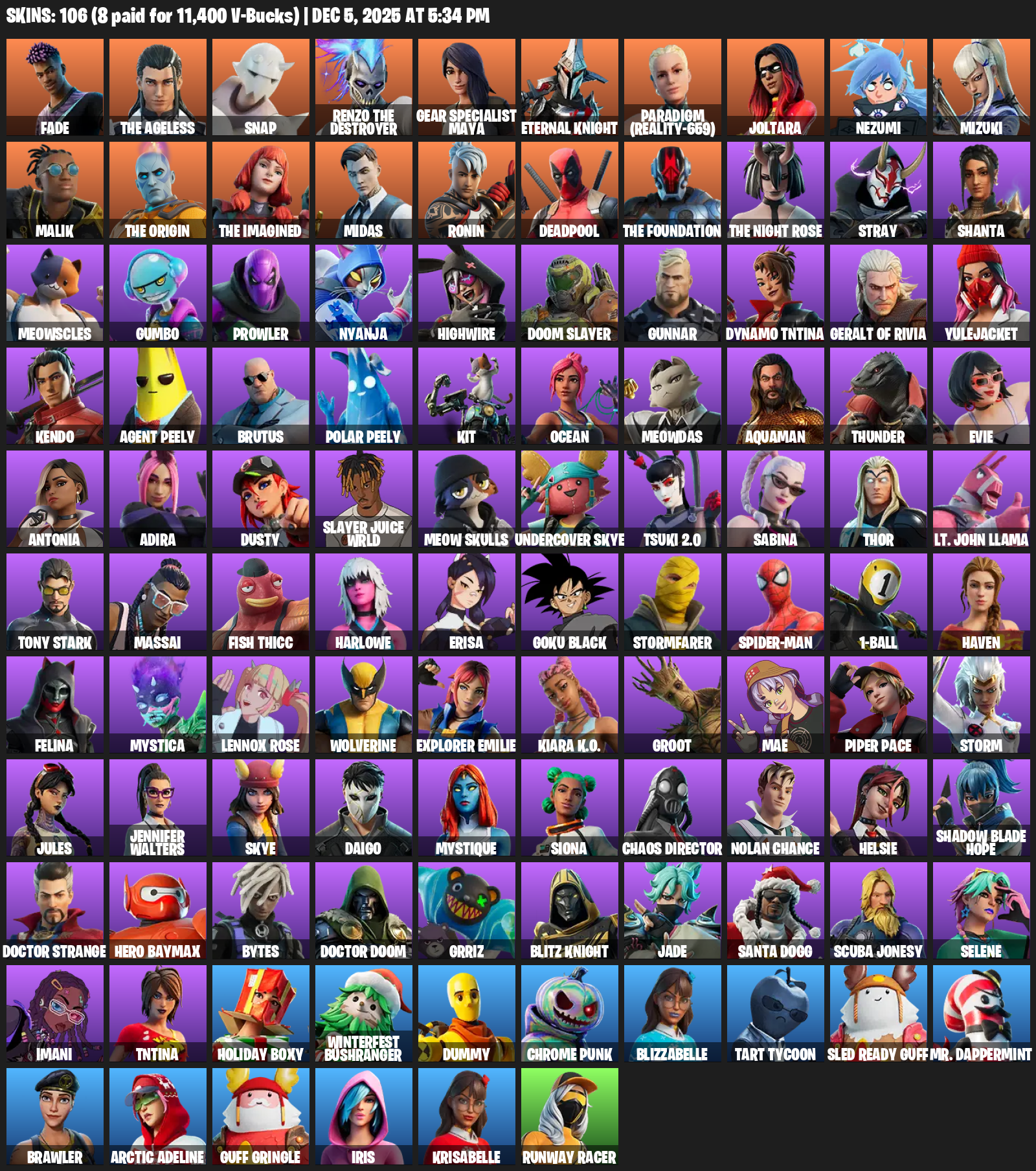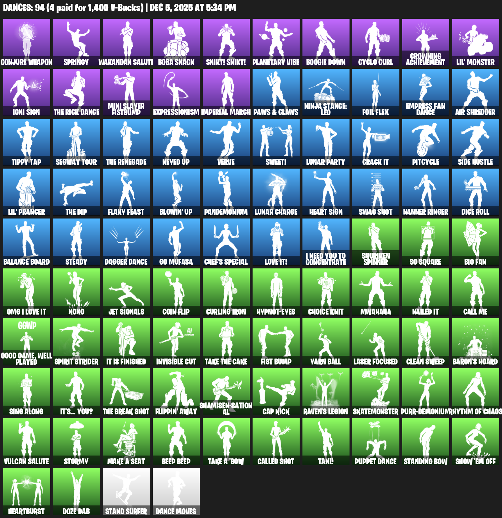 Conjure Weapon, Springy, Wakandan Salute, Boba Snack, Snikt! Snikt!, Planetary Vibe, Boogie Down, Cyclo Curl, Crowning Achievement, Lil’ Monster, Igni Sign, Mini Slayer Fistbump, Expressionism, Imperial March, Ninja Stance: Leo, Foil Flex, Empress Fan Dance, Air Shredder