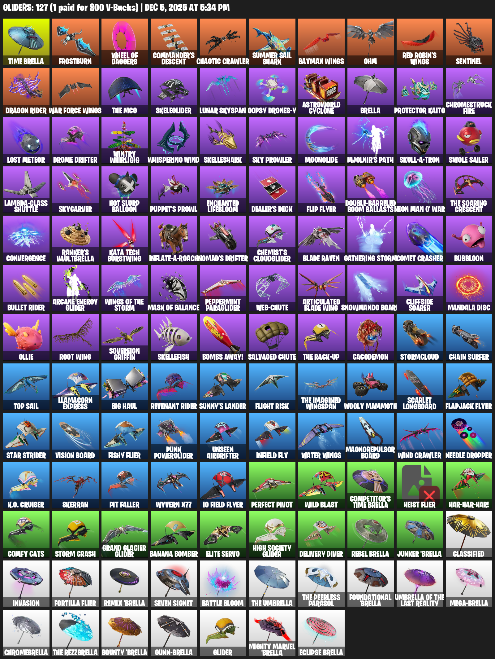 Time Brella, Frostburn, Commander’s Descent, Chaotic Crawler, Summer Sail Shark, Baymax Wings, Ohm, Sentinel, Dragon Rider, Skeleglider, Lunar Skyspan, Oopsy Drones-y, Astroworld Cyclone, Protector Kaito, Chromestruck Fire