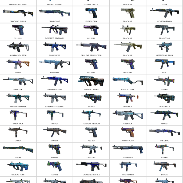 Merry Mint Axe, Reaper, Witcher’s Steel Sword, Wallopin’ Web Hammer, Spellwork Scimitar, Crucible Blade, Breaking Waves, Cubic Scepter, Guardian Daggers, Staff of Doom, Plasmacore Claws, Big Bite, Gilded Morphic Blades, Groot’s Sap Axes