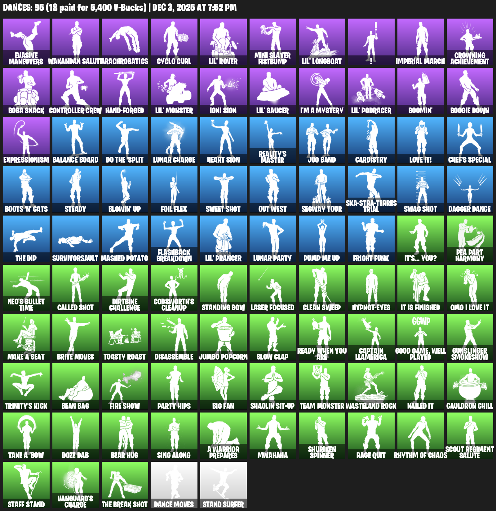 Evasive Maneuvers, Wakandan Salute, Arachrobatics, Cyclo Curl, Lil’ Rover, Mini Slayer Fistbump, !, Imperial March, Crowning Achievement, Boba Snack, Controller Crew, Hand-Forged, Igni Sign, I’m a Mystery, Boomin’, Boogie Down