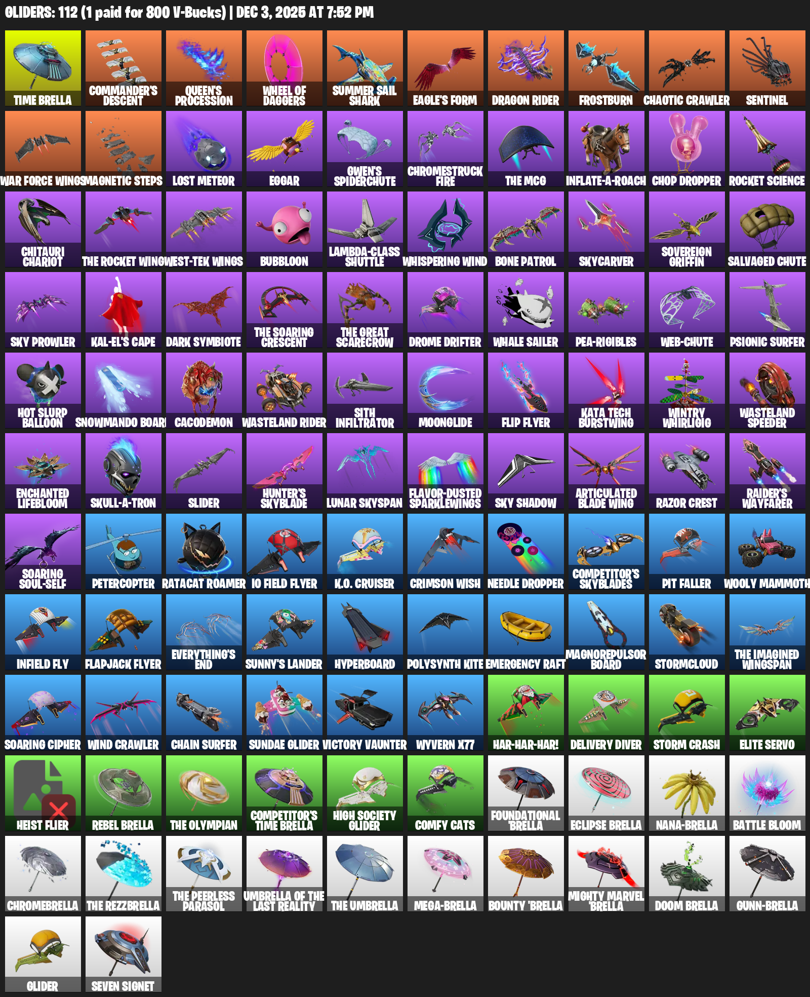 Time Brella, Commander’s Descent, Queen’s Procession, Wheel of Daggers, Summer Sail Shark, Dragon Rider, Frostburn, Chaotic Crawler, Sentinel, War Force Wings, Magnetic Steps, Lost Meteor, Eggar, Gwen’s Spiderchute, Chromestruck Fire, Chop Dropper, Rocket Science