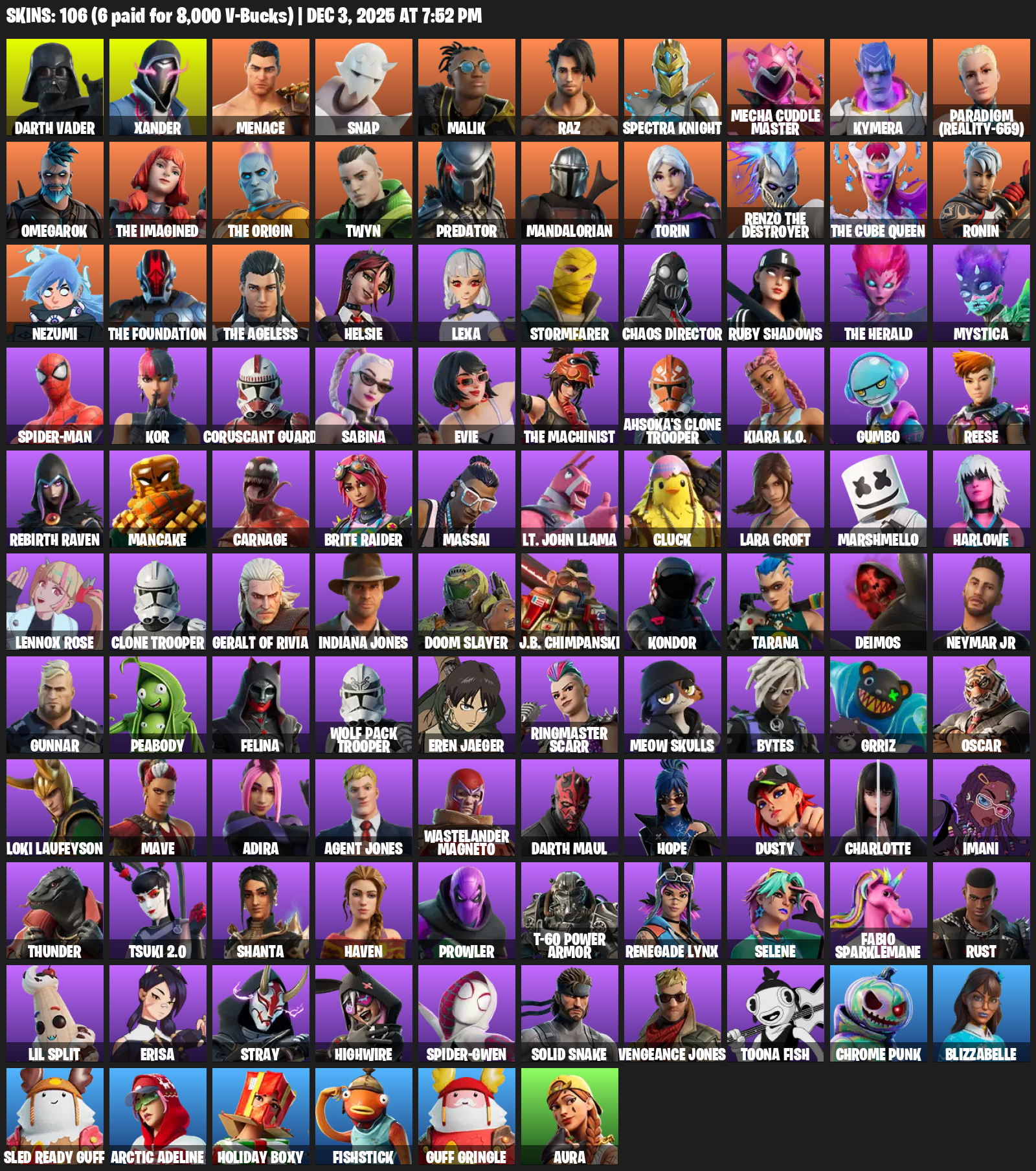 Lara Croft, Darth Vader, Xander, Menace, Snap, Malik, Raz, Spectra Knight, Mecha Cuddle Master, Kymera, Paradigm (Reality-659), Omegarok, The Imagined, Twyn, Predator, Mandalorian, Torin