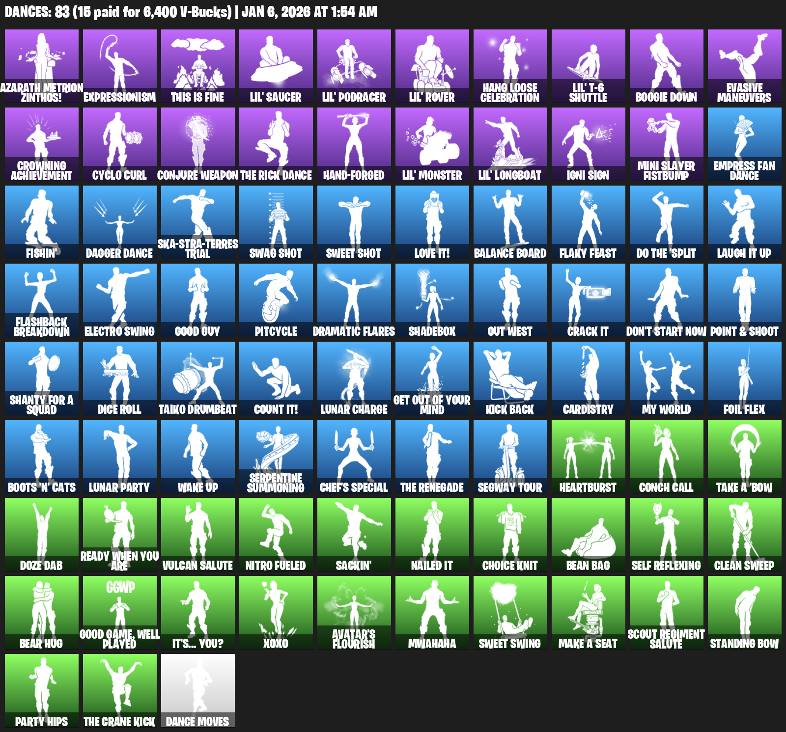 Azarath Metrion Zinthos!, Expressionism, This is Fine, Lil’ Saucer, Hang Loose Celebration, Boogie Down, Evasive Maneuvers, Crowning Achievement, Cyclo Curl, Conjure Weapon, Hand-Forged, Igni Sign, Mini Slayer Fistbump, Empress Fan Dance