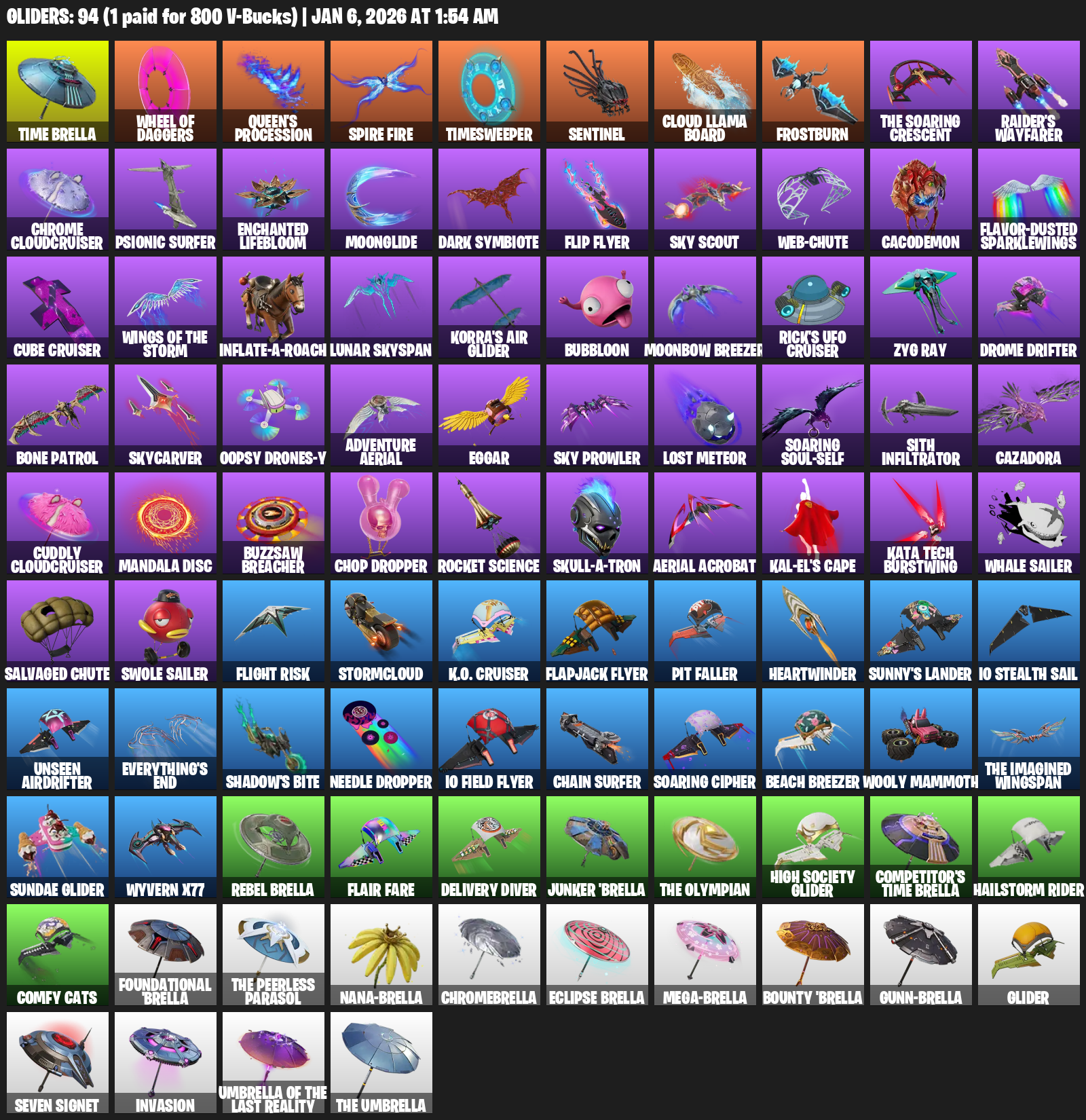 Time Brella, Queen’s Procession, Timesweeper, Sentinel, Cloud Llama Board, Frostburn, Raider’s Wayfarer, Chrome Cloudcruiser, Psionic Surfer, Enchanted Lifebloom, Moonglide, Dark Symbiote, Flip Flyer, Sky Scout, Web-Chute, Cacodemon, Flavor-Dusted Sparklewings
