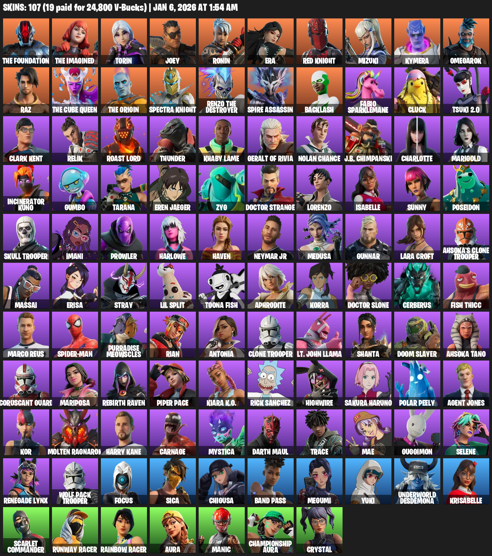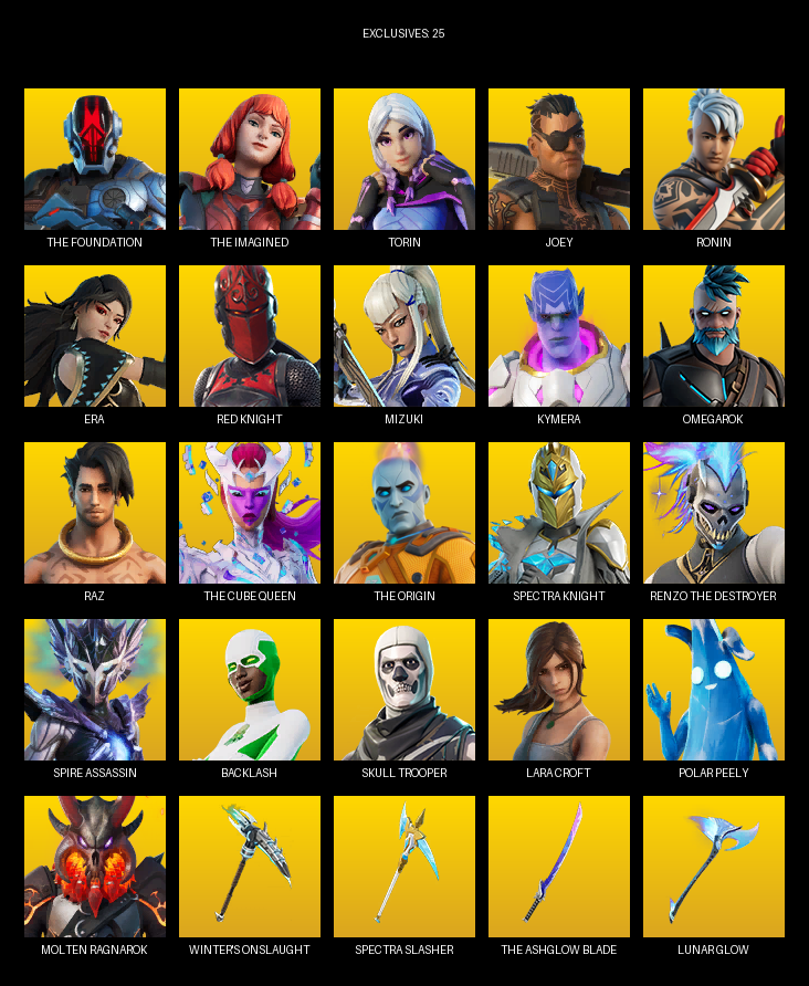 Lara Croft, The Foundation, Torin, Joey, Ronin, Era, Red Knight, Mizuki, Kymera, Omegarok, Raz, Spire Assassin, Backlash, Fabio Sparklemane, Cluck