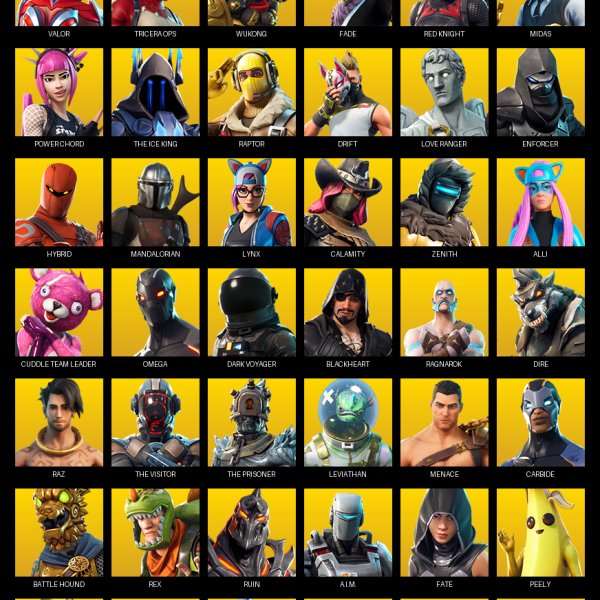 Gear Specialist Maya, Lara Croft, Catalyst, Raz, Peter Griffin, Midas, Kymera, Rox, Mandalorian, Sentinel, Eternal Knight, Fusion, Blackheart, Valeria, Hybrid, Spire Assassin, Vi, Deadpool, Menace, Fade