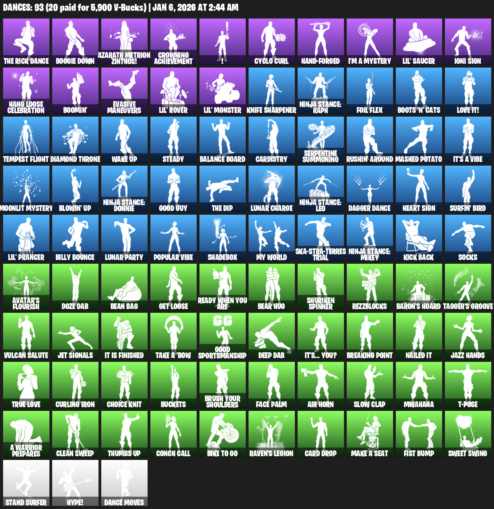Boogie Down, Azarath Metrion Zinthos!, Crowning Achievement, !, Cyclo Curl, Hand-Forged, I’m a Mystery, Lil’ Saucer, Igni Sign, Hang Loose Celebration, Boomin’, Evasive Maneuvers, Knife Sharpener, Ninja Stance: Raph, Foil Flex, Boots ‘n’ Cats, Love it!