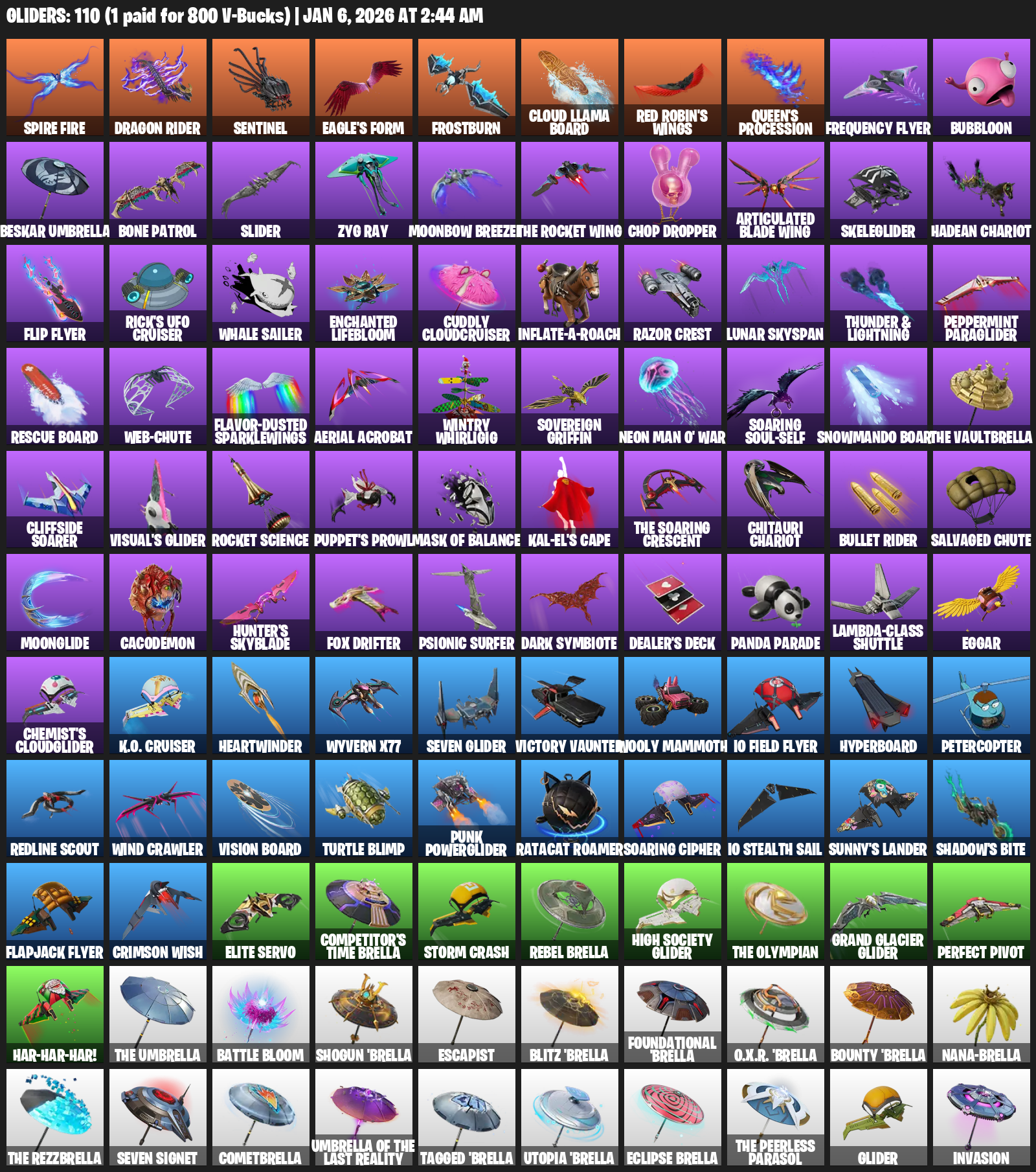 Dragon Rider, Sentinel, Eagle’s Form, Frostburn, Cloud Llama Board, Queen’s Procession, Frequency Flyer, Bubbloon, Beskar Umbrella, Bone Patrol, Slider, Zyg Ray, Moonbow Breezer, Chop Dropper, Articulated Blade Wing, Skeleglider