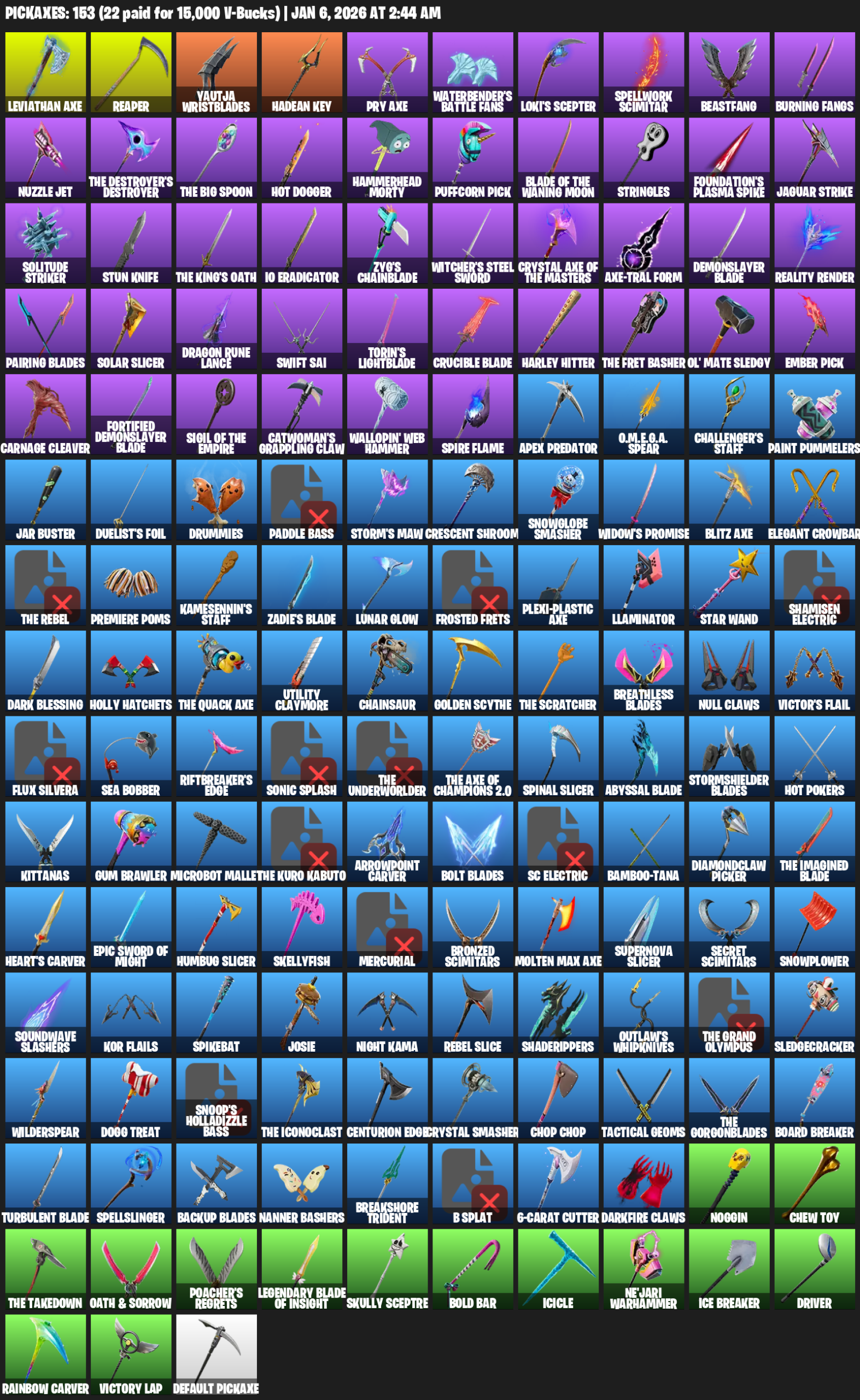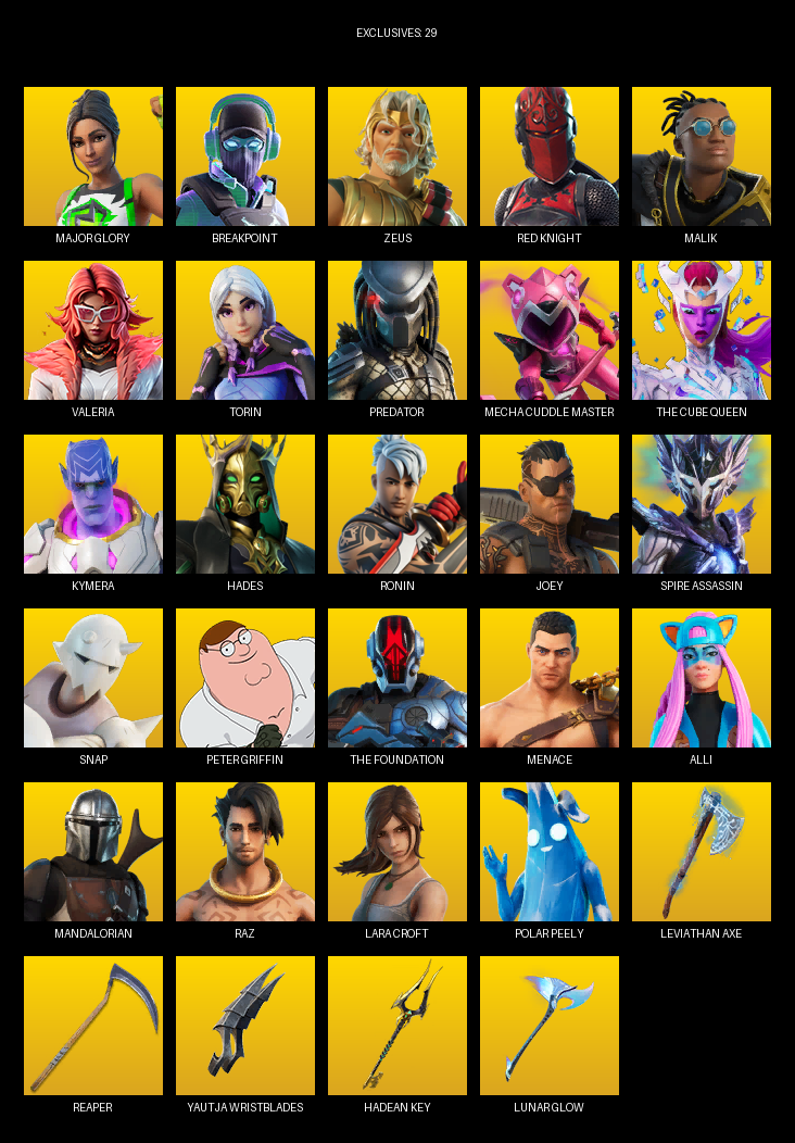 Leviathan Axe, Reaper, Yautja Wristblades, Hadean Key, Waterbender’s Battle Fans, Loki’s Scepter, Spellwork Scimitar, Beastfang, Burning Fangs, Nuzzle Jet, HOT DOGGER, Hammerhead Morty, Puffcorn Pick, Stringles, Foundation’s Plasma Spike, Jaguar Strike
