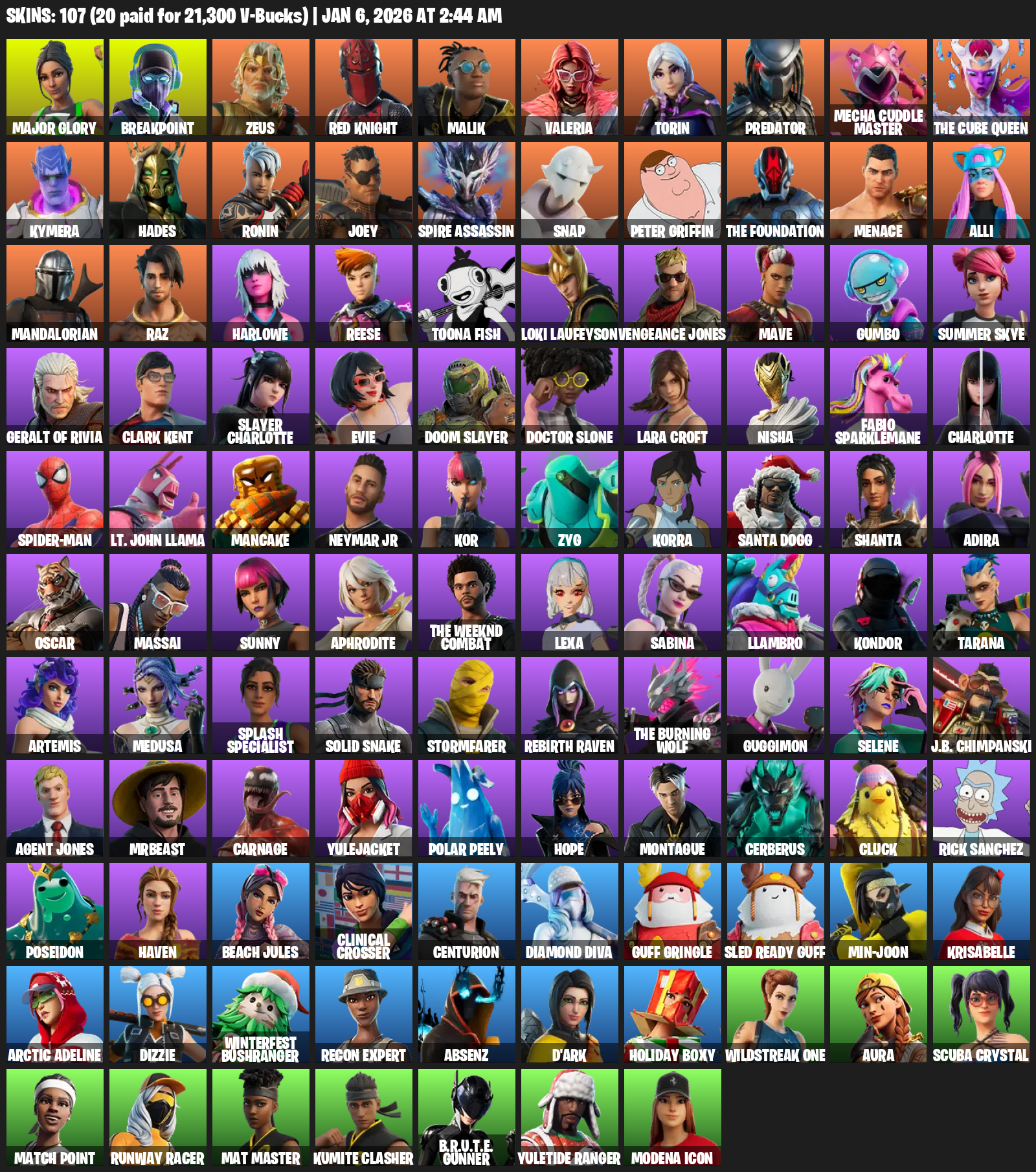 Lara Croft, Major Glory, Breakpoint, Zeus, Red Knight, Malik, Valeria, Torin, Predator, Mecha Cuddle Master, The Cube Queen, Kymera, Hades, Ronin, Joey, Spire Assassin, Snap, Peter Griffin, Menace