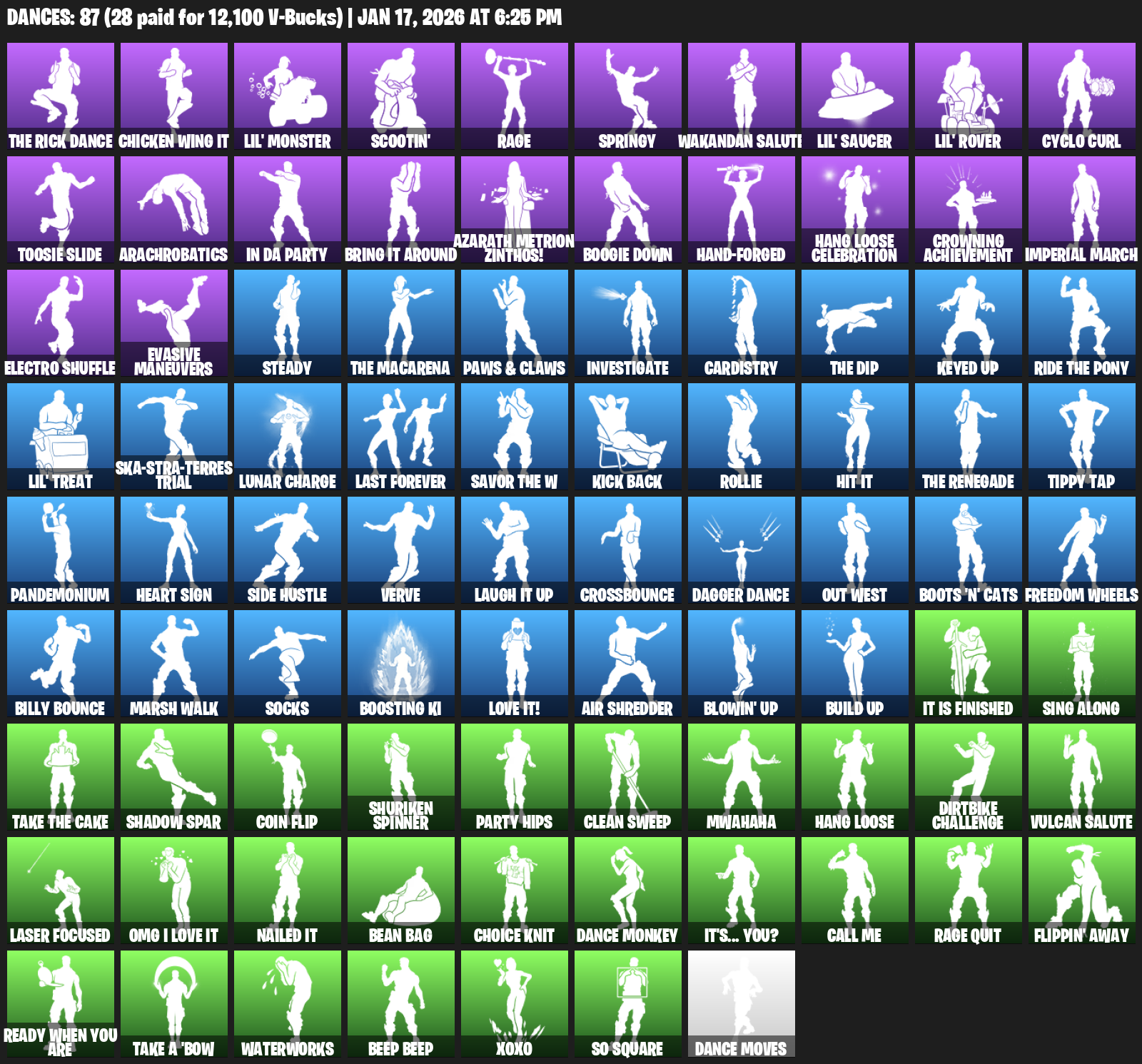 Chicken Wing It, Lil’ Monster, Scootin’, Rage, Springy, Wakandan Salute, Cyclo Curl, Toosie Slide, Arachrobatics, In Da Party, Azarath Metrion Zinthos!, Boogie Down, Hand-Forged, Hang Loose Celebration, Crowning Achievement, Imperial March