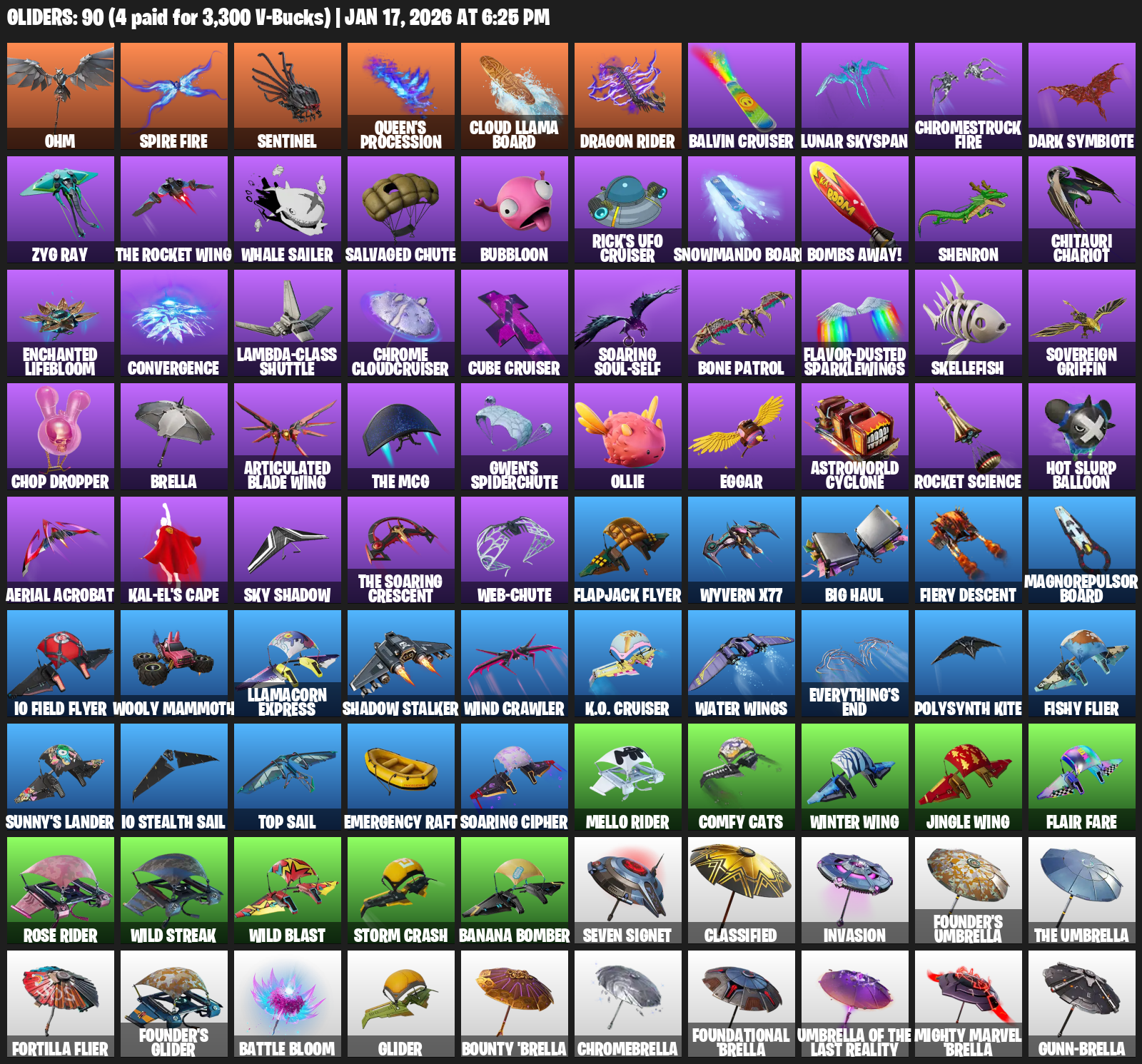 Ohm, Sentinel, Queen’s Procession, Cloud Llama Board, Dragon Rider, Balvin Cruiser, Lunar Skyspan, Chromestruck Fire, Dark Symbiote, Zyg Ray, Whale Sailer, Salvaged Chute, Bubbloon, Bombs Away!, Shenron, Chitauri Chariot