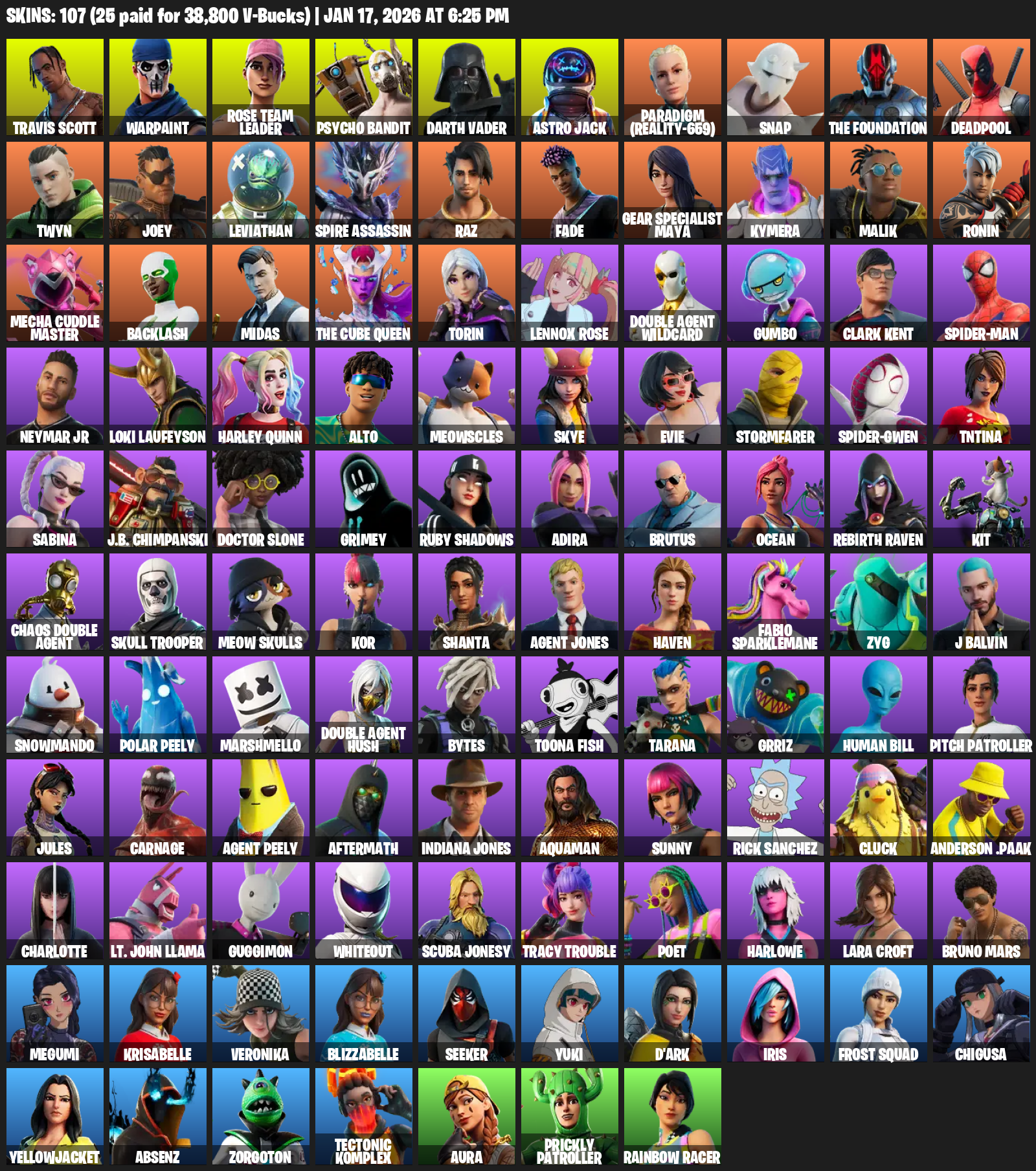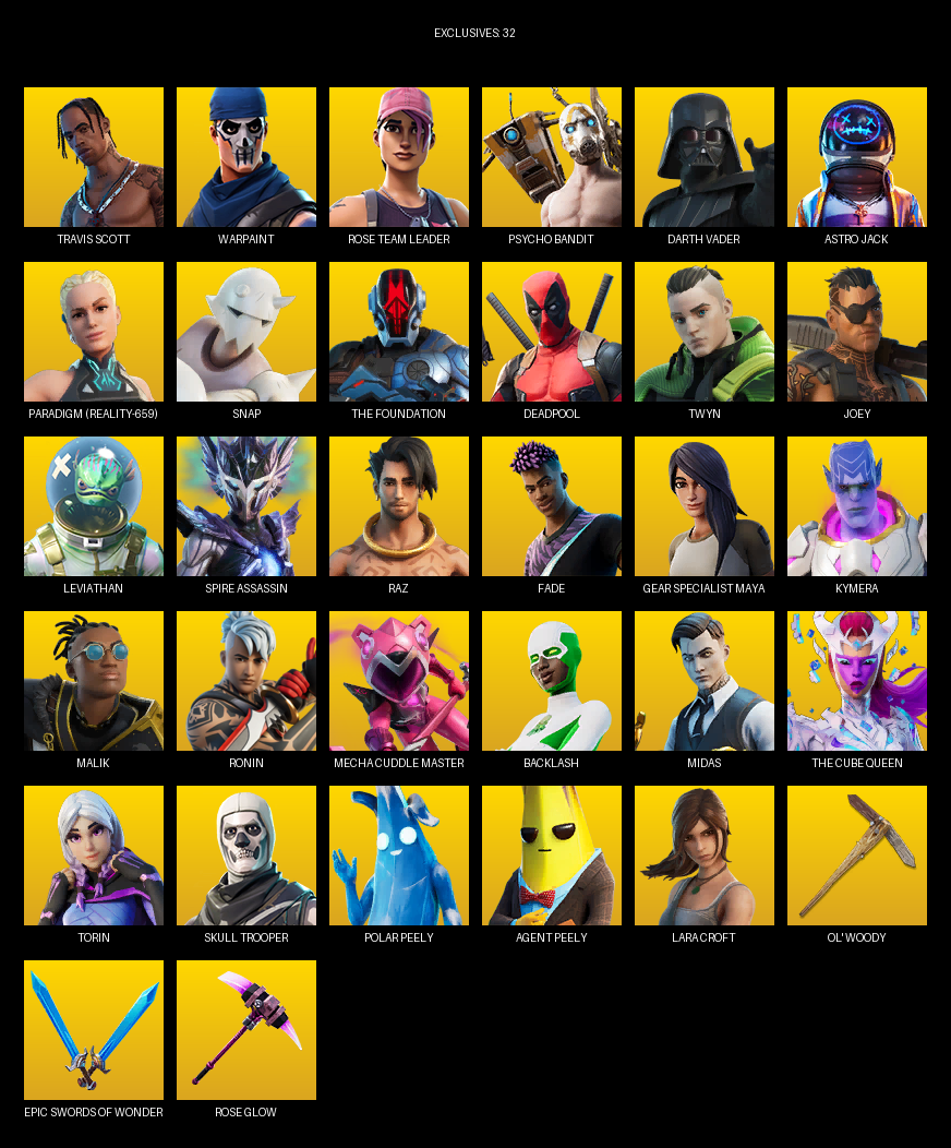 Travis Scott, Gear Specialist Maya, Lara Croft, Warpaint, Rose Team Leader, Psycho Bandit, Darth Vader, Astro Jack, Paradigm (Reality-659), Snap, The Foundation, Deadpool, Twyn, Joey, Leviathan, Spire Assassin, Raz, Fade, Kymera, Malik