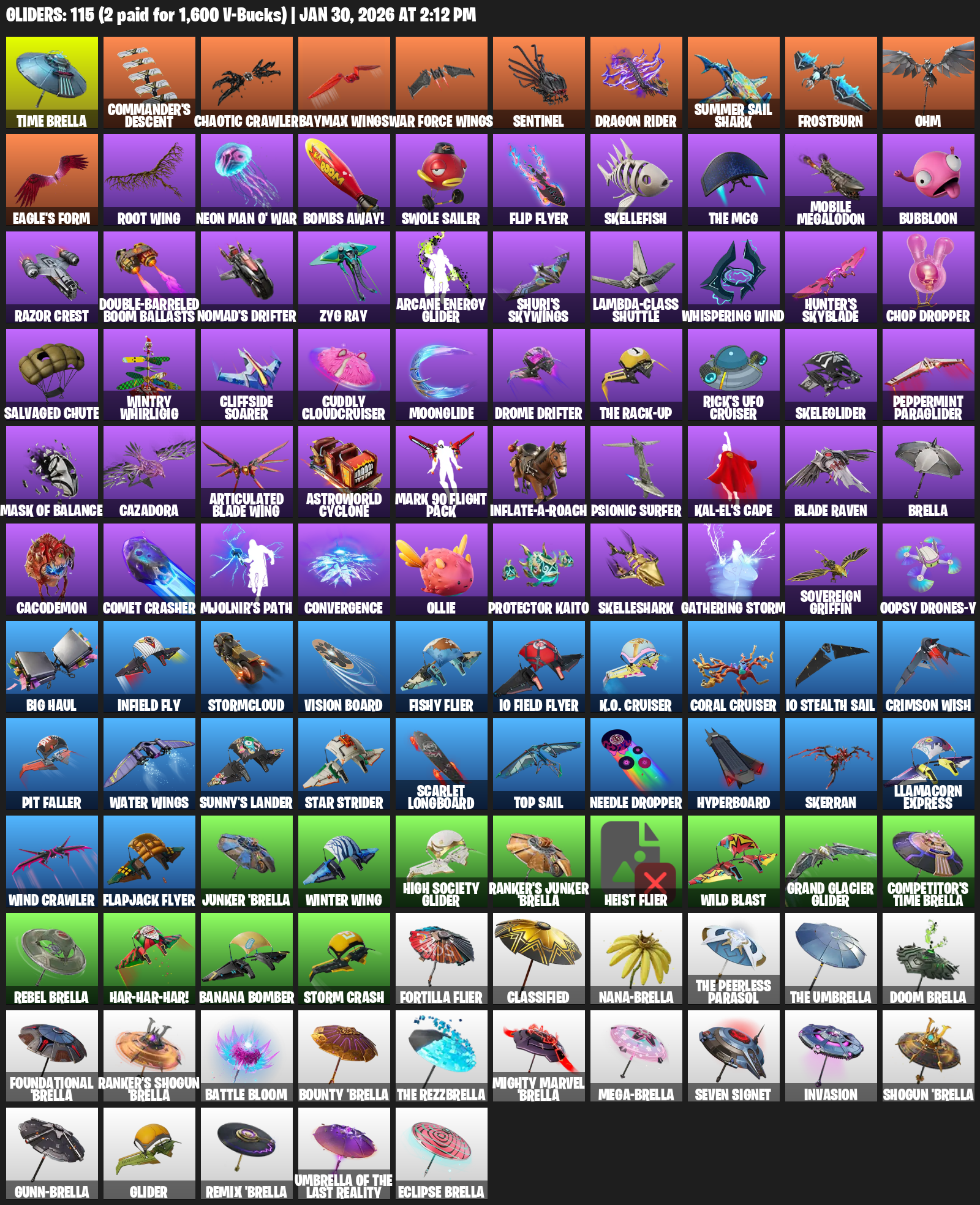 Time Brella, Commander’s Descent, Chaotic Crawler, Baymax Wings, Sentinel, Summer Sail Shark, Frostburn, Ohm, Eagle’s Form, Root Wing, Neon Man O’ War, Bombs Away!, Swole Sailer, Flip Flyer, Skellefish, Mobile Megalodon, Bubbloon