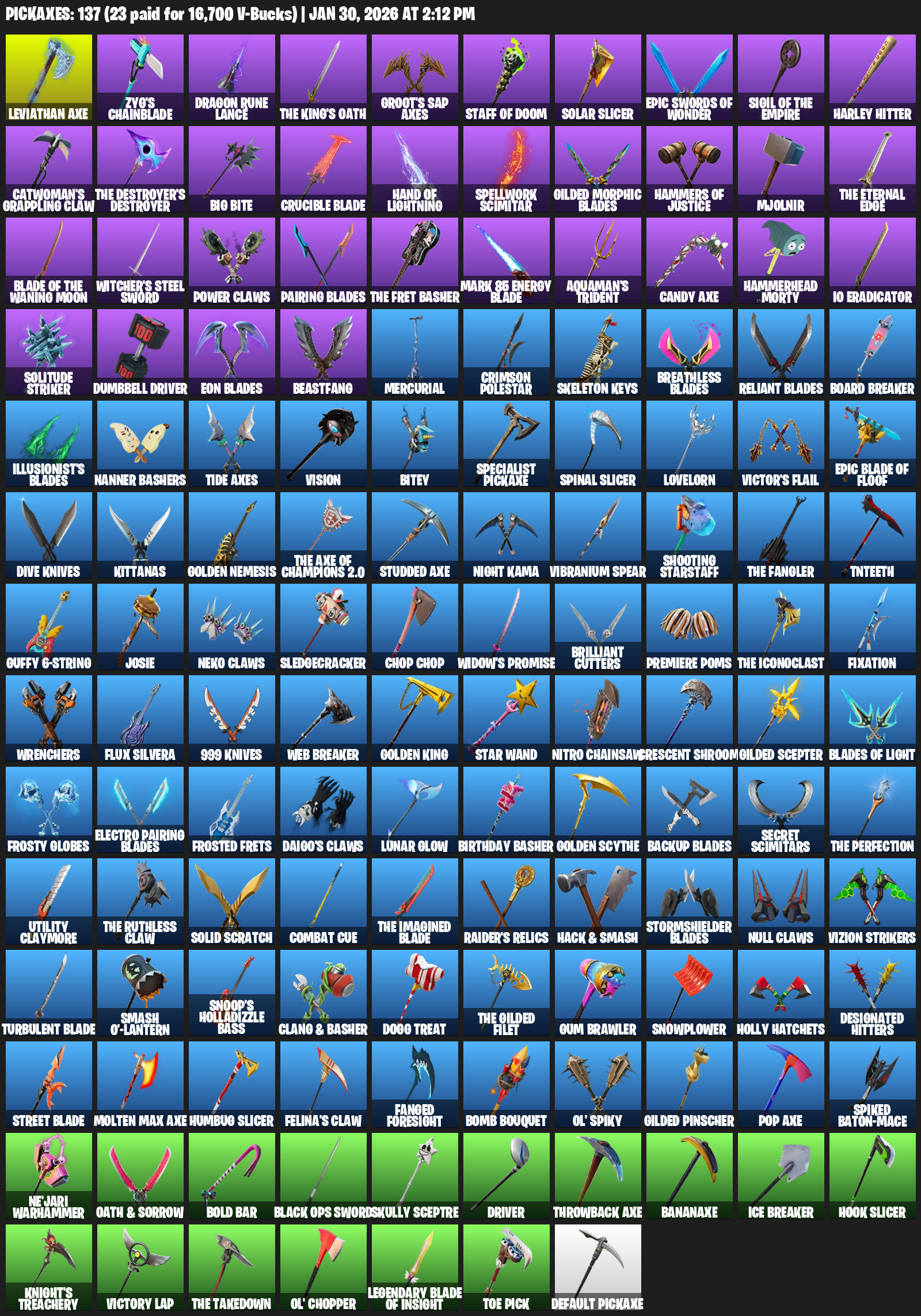 Leviathan Axe, Zyg’s Chainblade, Dragon Rune Lance, Groot’s Sap Axes, Solar Slicer, Harley Hitter, Catwoman’s Grappling Claw, Big Bite, Crucible Blade, Hand of Lightning, Spellwork Scimitar, Gilded Morphic Blades, Mjolnir