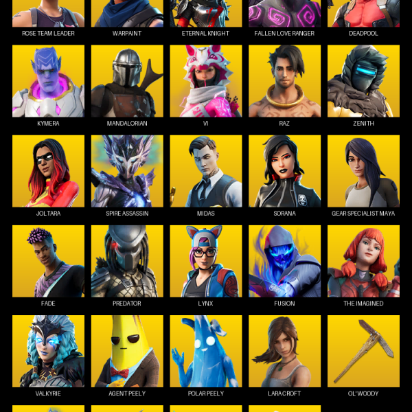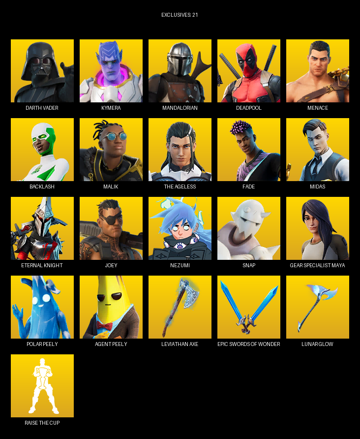 Gear Specialist Maya, Darth Vader, Kymera, Mandalorian, Deadpool, Menace, Backlash, Malik, The Ageless, Fade, Midas, Eternal Knight, Joey, Nezumi, Snap, Doom Slayer, Mave, Scuba Jonesy, Jules